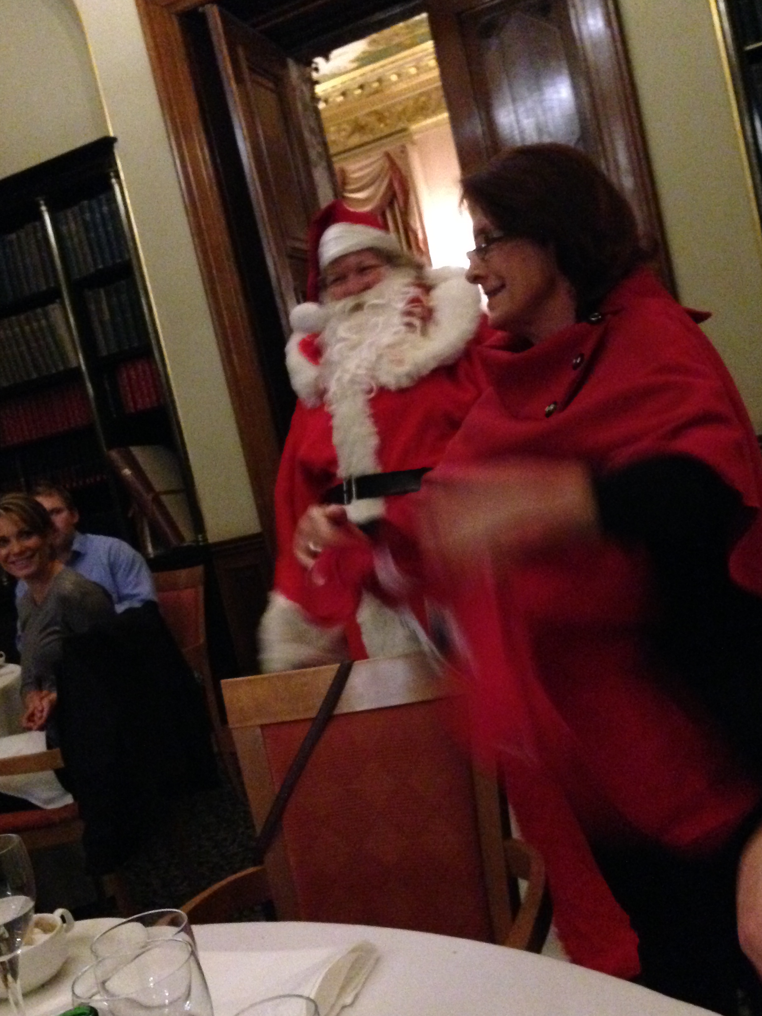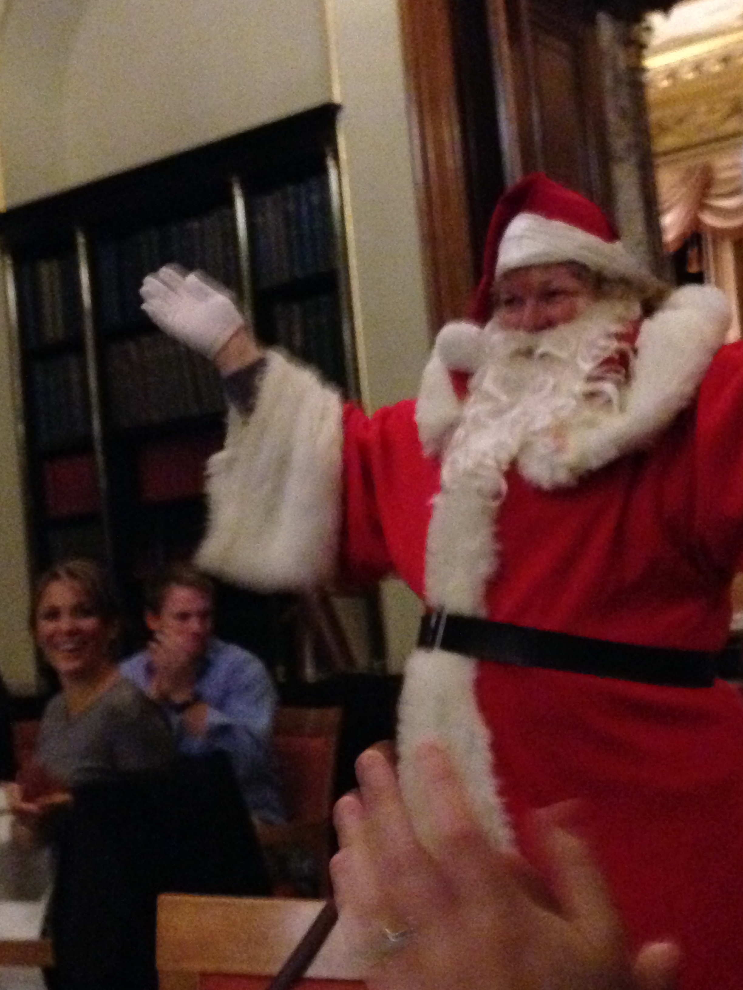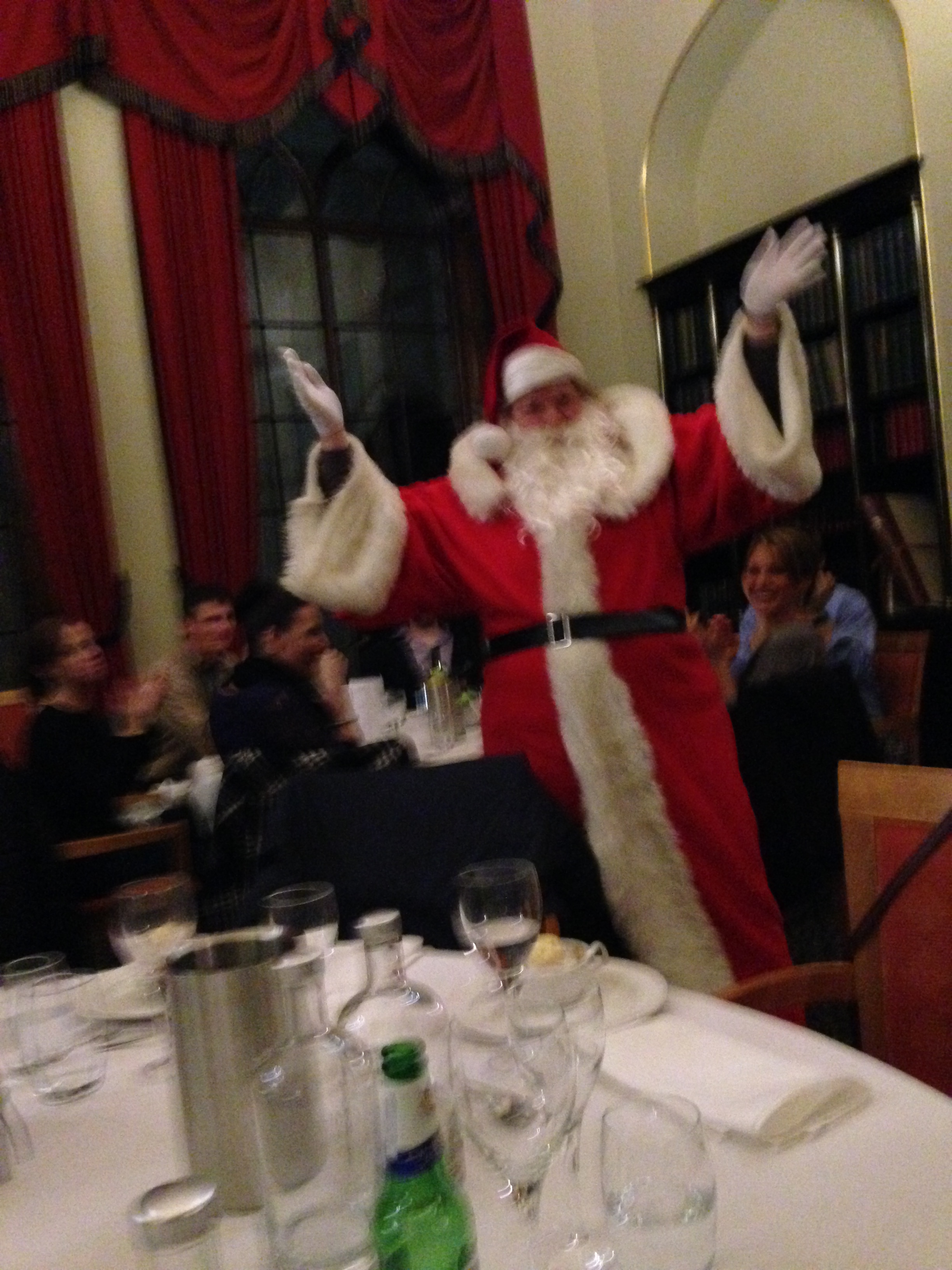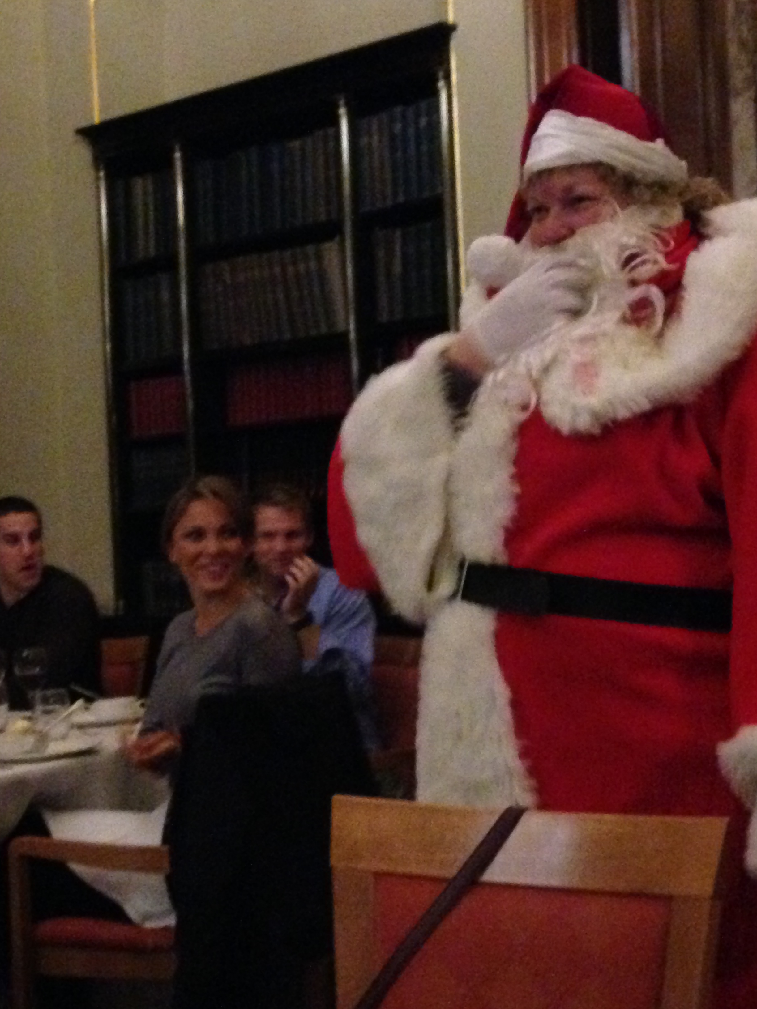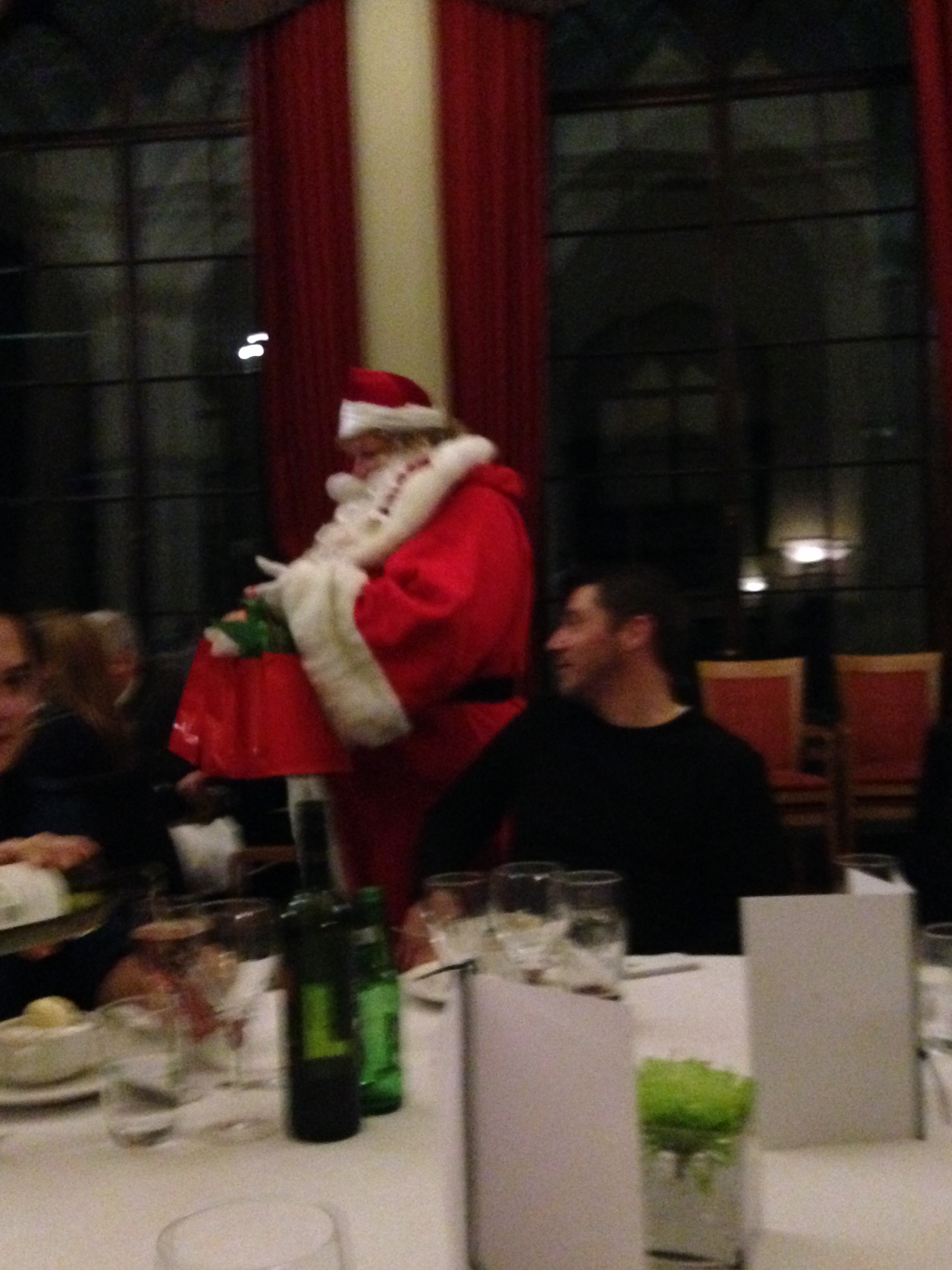 Pat had arranged for gifts for each student, a t-shirt she designed with pics from the two schools and of course the Grand Place’ in Brussels on it and their MPOD 9 cohort designation. I played Father Christmas from a loaned costume from Ashridge Faculty! It was a lot of fun; then back to the room for the final packing. I started the photo upload and then went right to bed. Now, at 3am I’m up, inserting the photos into this post and finishing off the text! Then I’m back to bed for the remainder of my sleep. We hope to get up in the morning and attend the weekly service in the chapel before our ride to Euston Station on our adventure to Vienna. I hope all goes smoothly as I purchased all the tickets for this leisure leg of the trip. I think I did it right!!!! G’night!