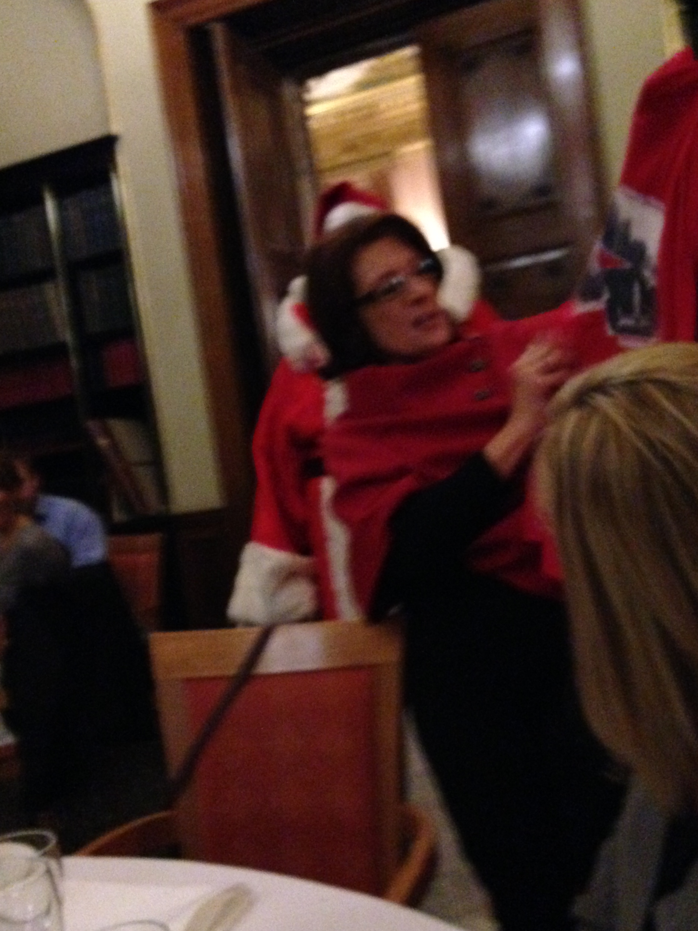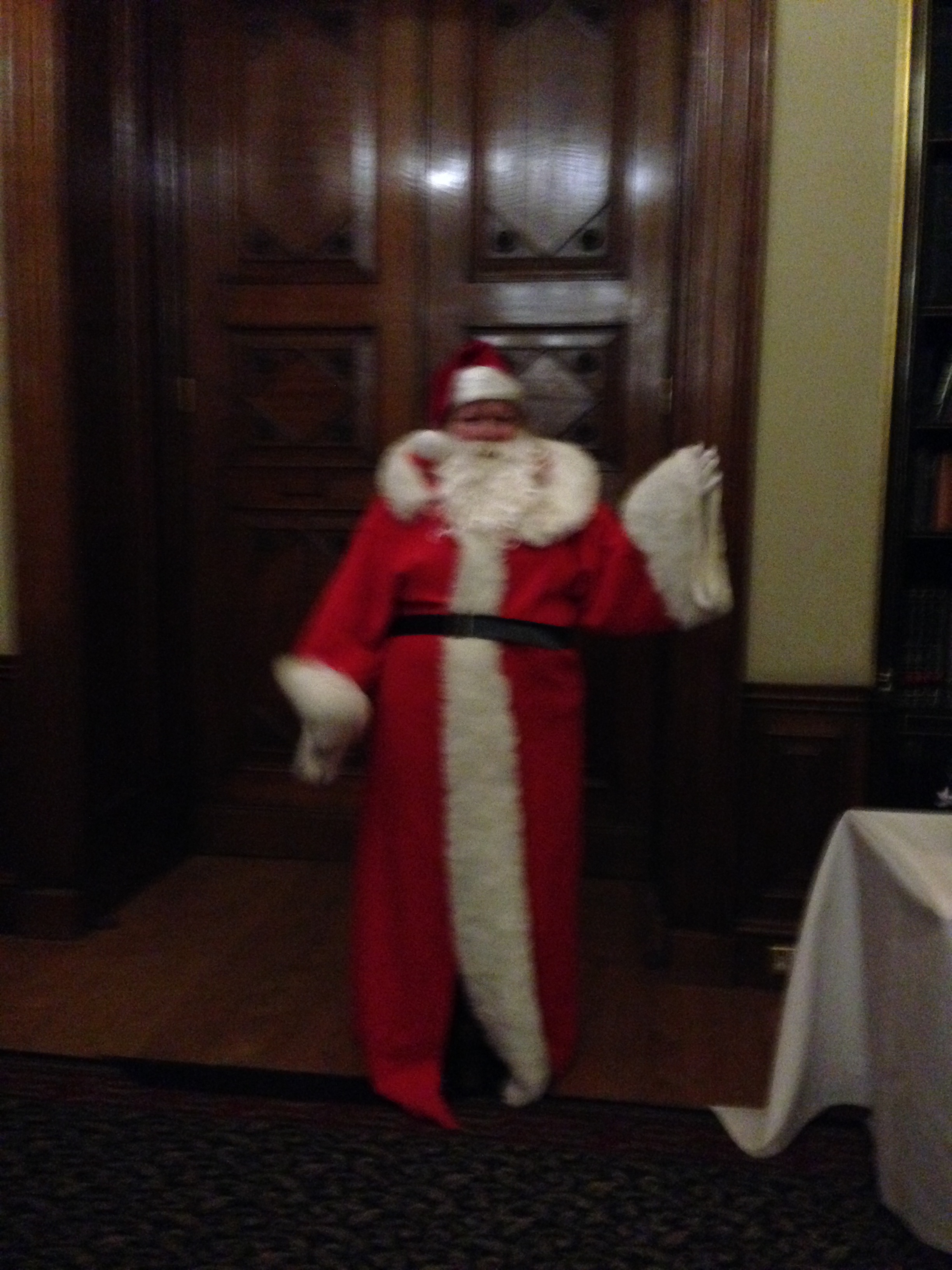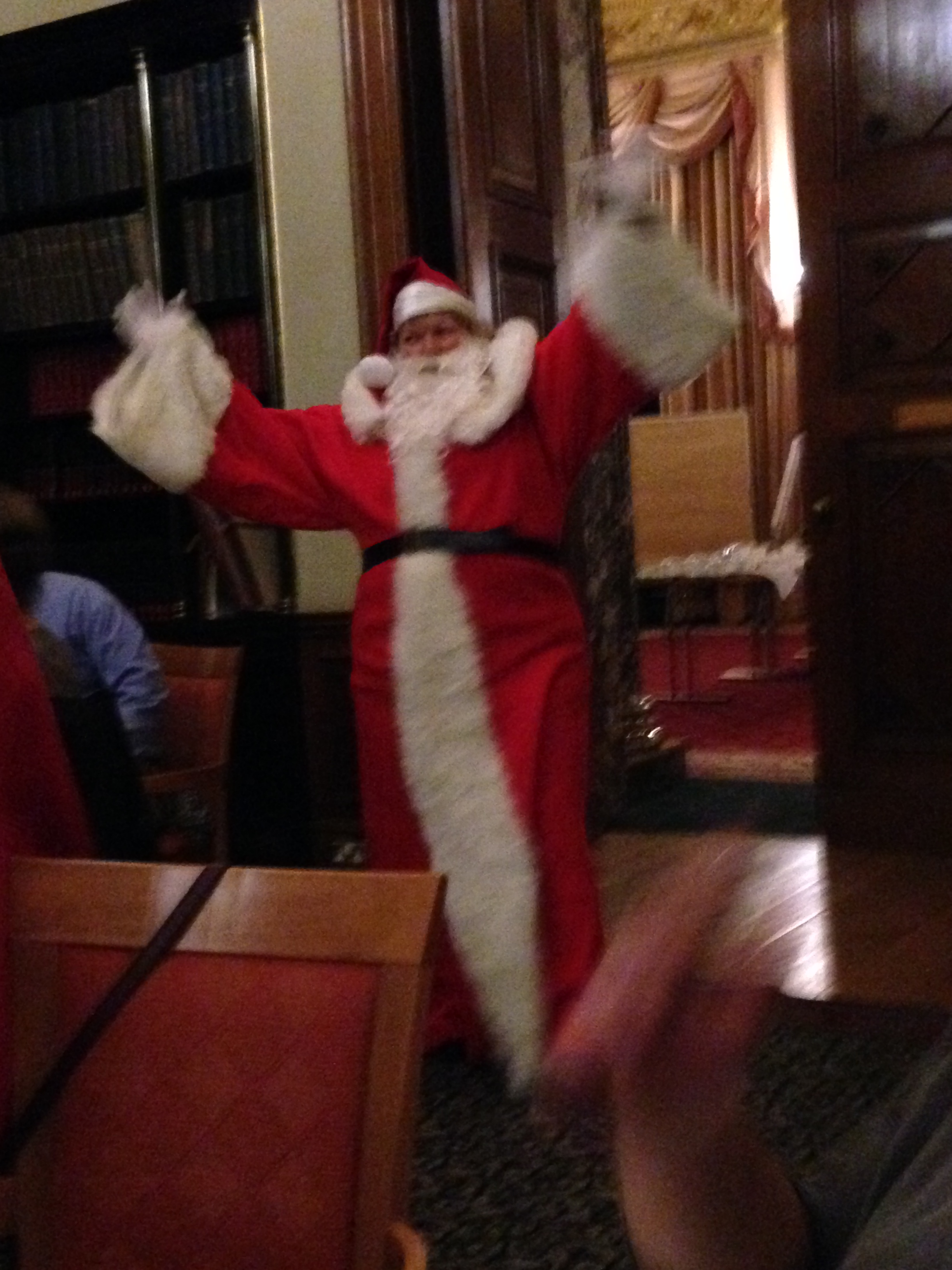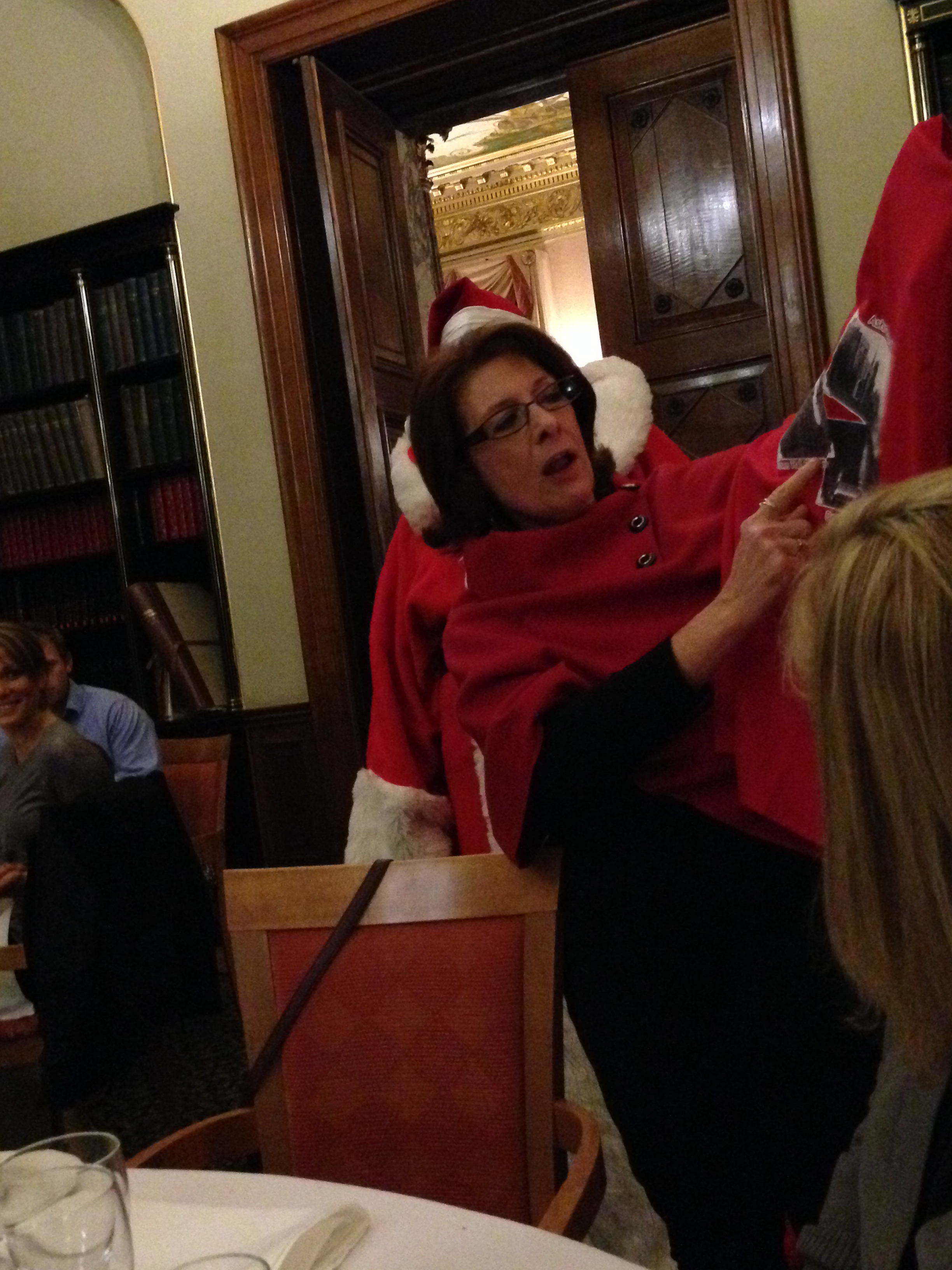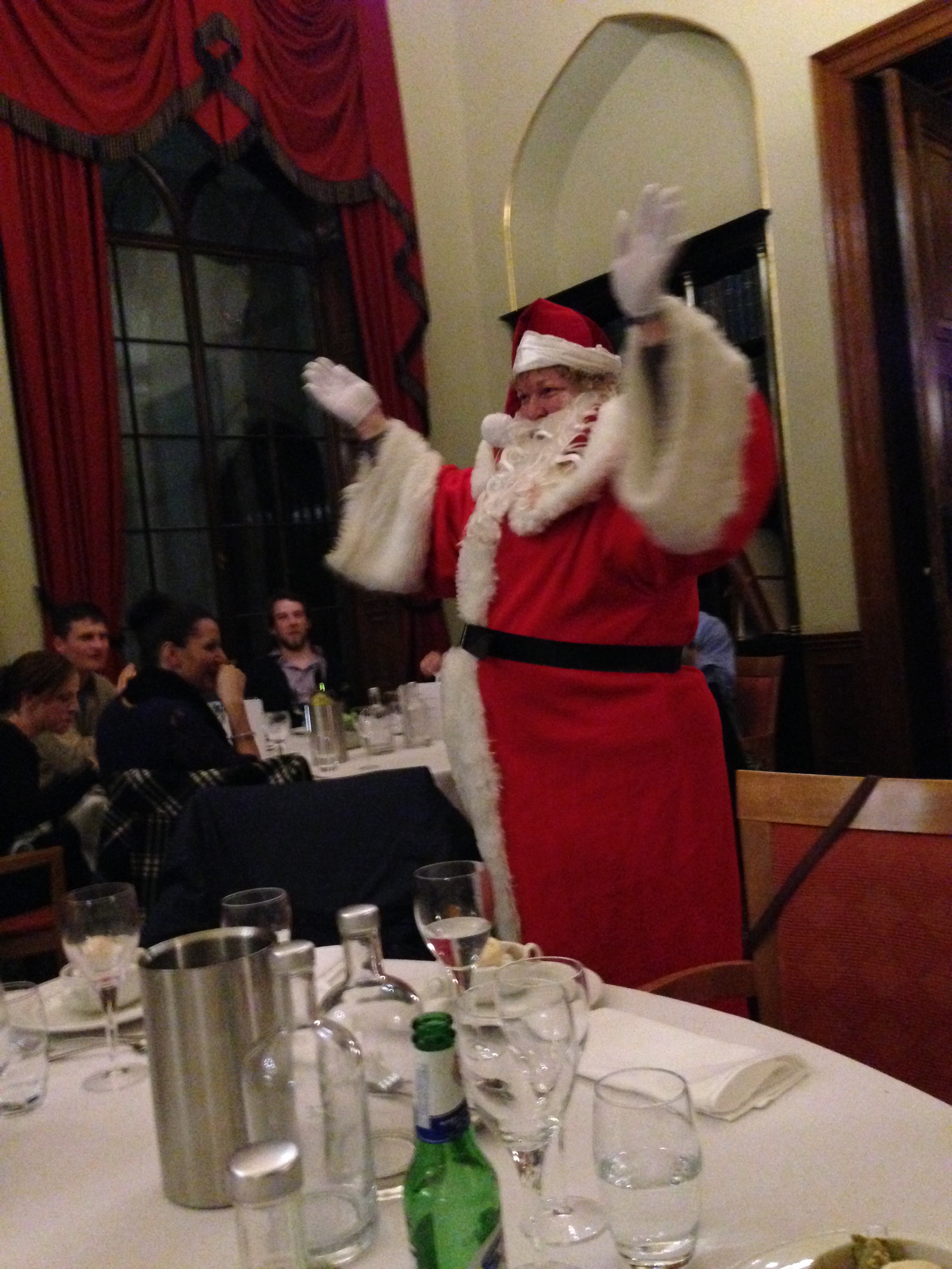 Pat had arranged for gifts for each student, a t-shirt she designed with pics from the two schools and of course the Grand Place’ in Brussels on it and their MPOD 9 cohort designation. I played Father Christmas from a loaned costume from Ashridge Faculty! It was a lot of fun; then back to the room for the final packing. I started the photo upload and then went right to bed. Now, at 3am I’m up, inserting the photos into this post and finishing off the text! Then I’m back to bed for the remainder of my sleep. We hope to get up in the morning and attend the weekly service in the chapel before our ride to Euston Station on our adventure to Vienna. I hope all goes smoothly as I purchased all the tickets for this leisure leg of the trip. I think I did it right!!!! G’night!