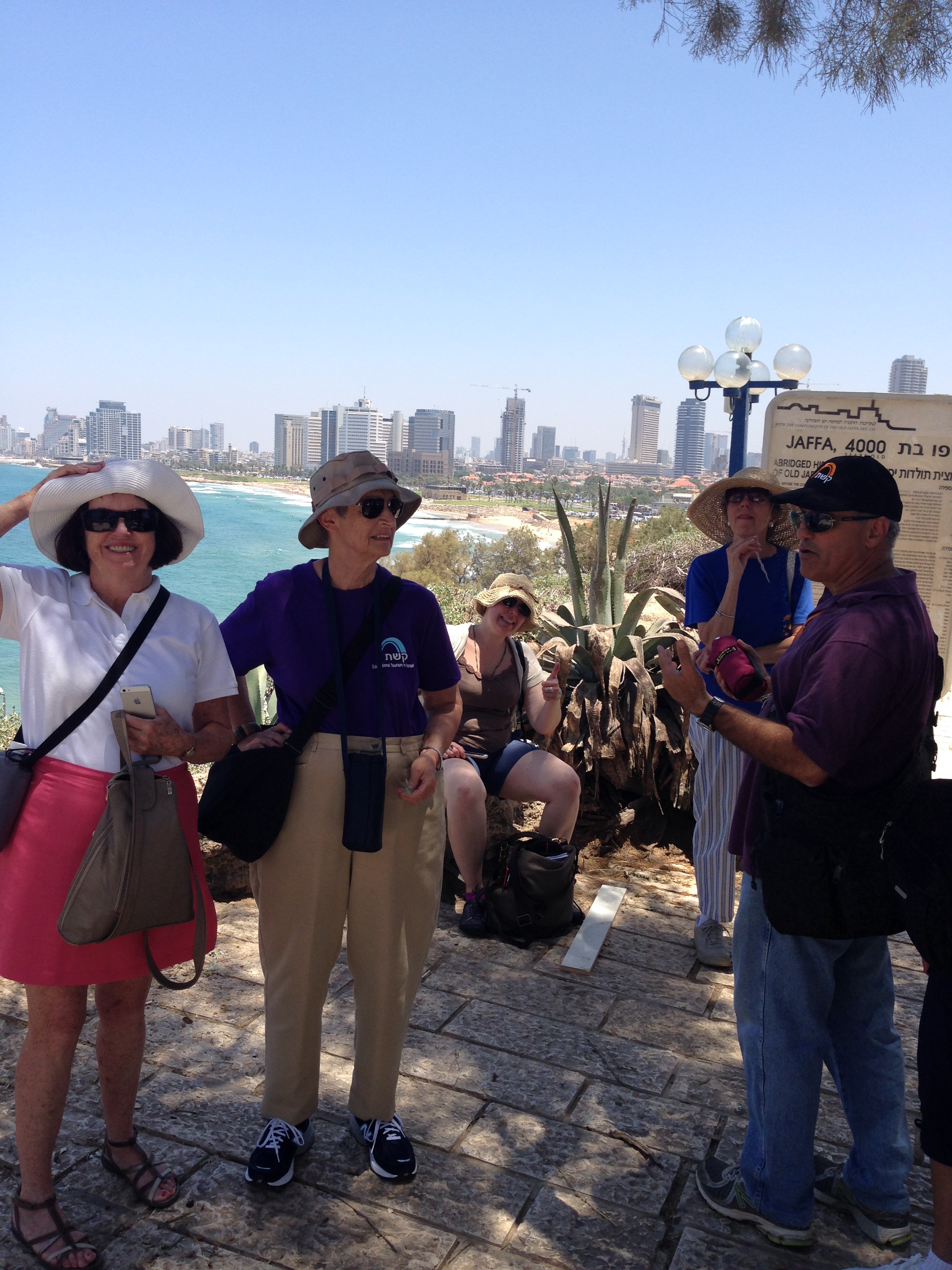 I was able to get Michael his own room last night and then we met back up for breakfast with the whole group this morning. Everyone in this group is really fantastic. I’ve been very lucky on my “independent” travels that all the folks I’ve had the luck to travel with have been exceptional people. And they all rallied around Michael! I think Michael got a send-off from nearly a dozen “moms” and they were all so sweet to him. We only have one gentleman in our tour group; but we have a male van driver and our incredible guide, Amos Davidovitz! (you can google him–he’s brilliant). And Amos decided that they would drive Michael to the train station on our way to Jaffa today. That saved him at least 30 shekels or more (which equates to about $10 I think. And we all got to wish him a happy goodbye! He did fine, notified me via text, and took the train to Haifa and then caught a bus to just outside of the Kibbutz and then was picked up by someone from there. We had arrived at the rear entrance to the museum but walked out the front and from the top of the steps I got lovely pics of the overview of campus and the Mediterranean Sea in the background! Here’s a link to a little more info if you’re interested: