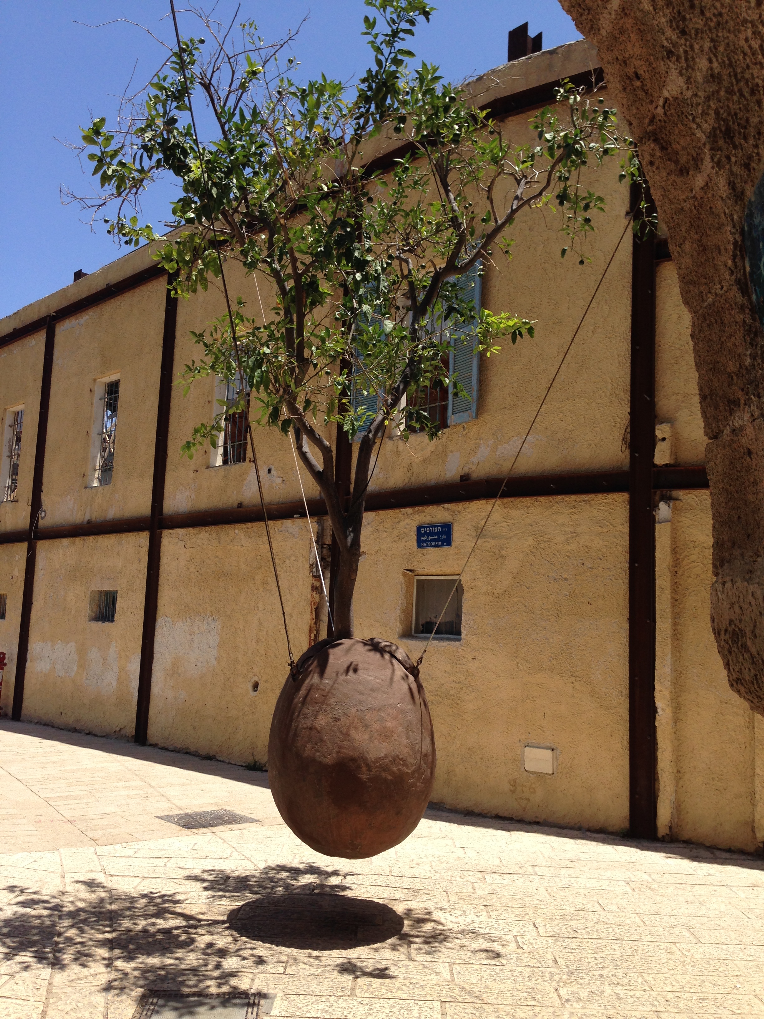 real loive trea growing out of a cement “olive” commemorating the re-livening of the Jaffa community with its artist cology.