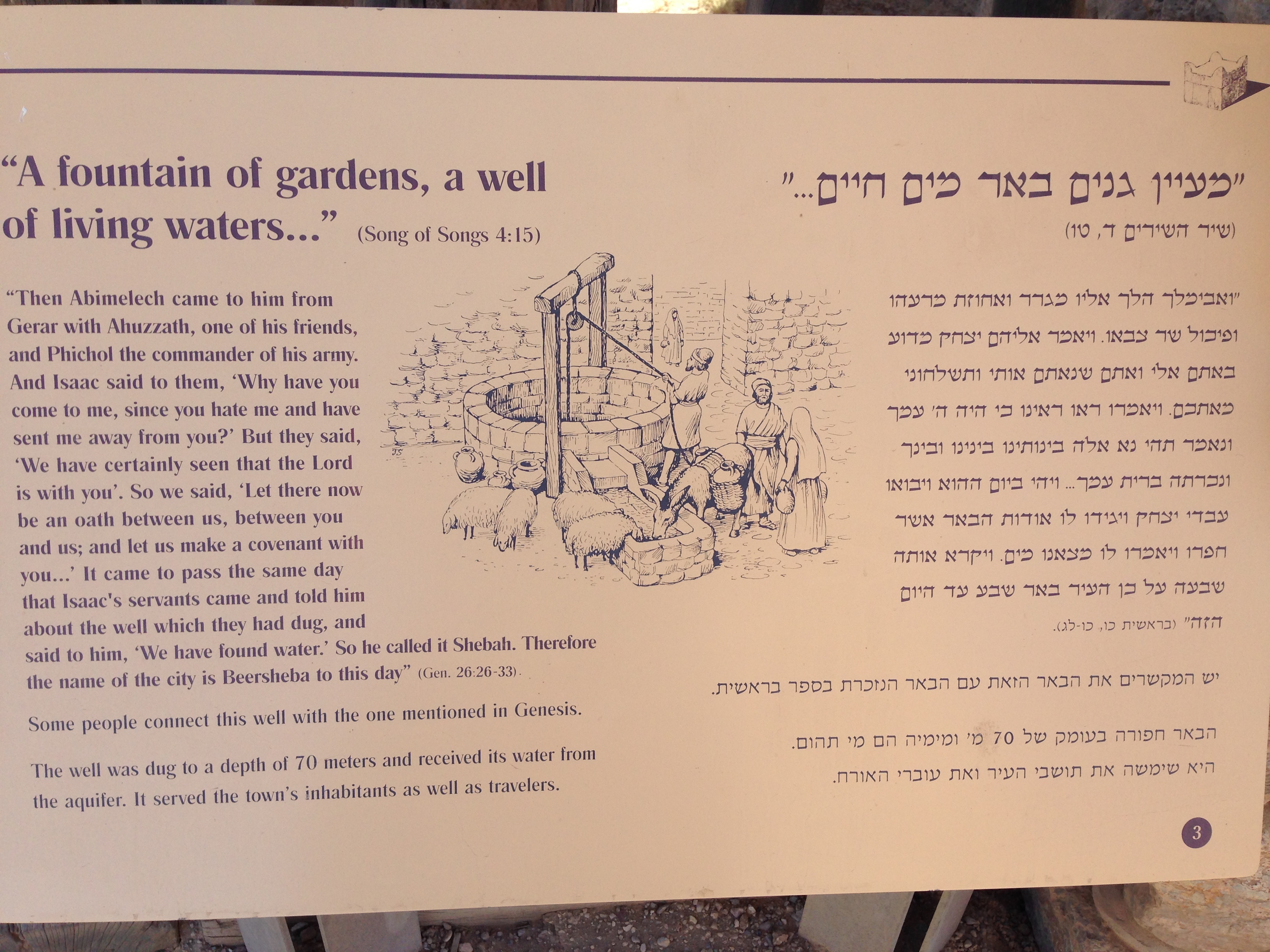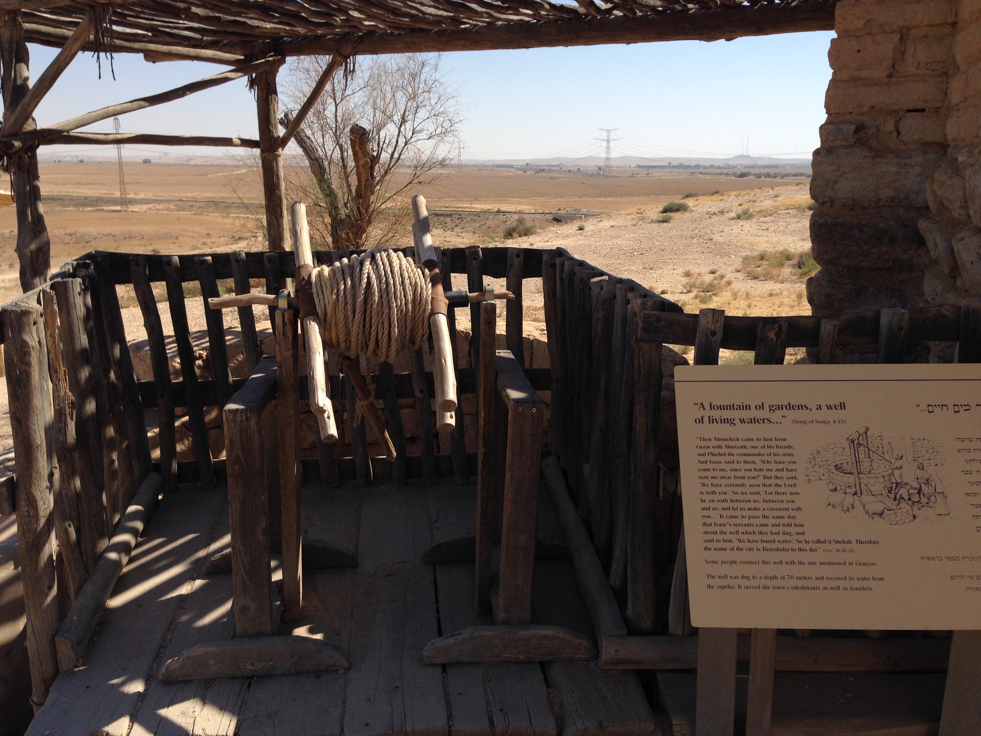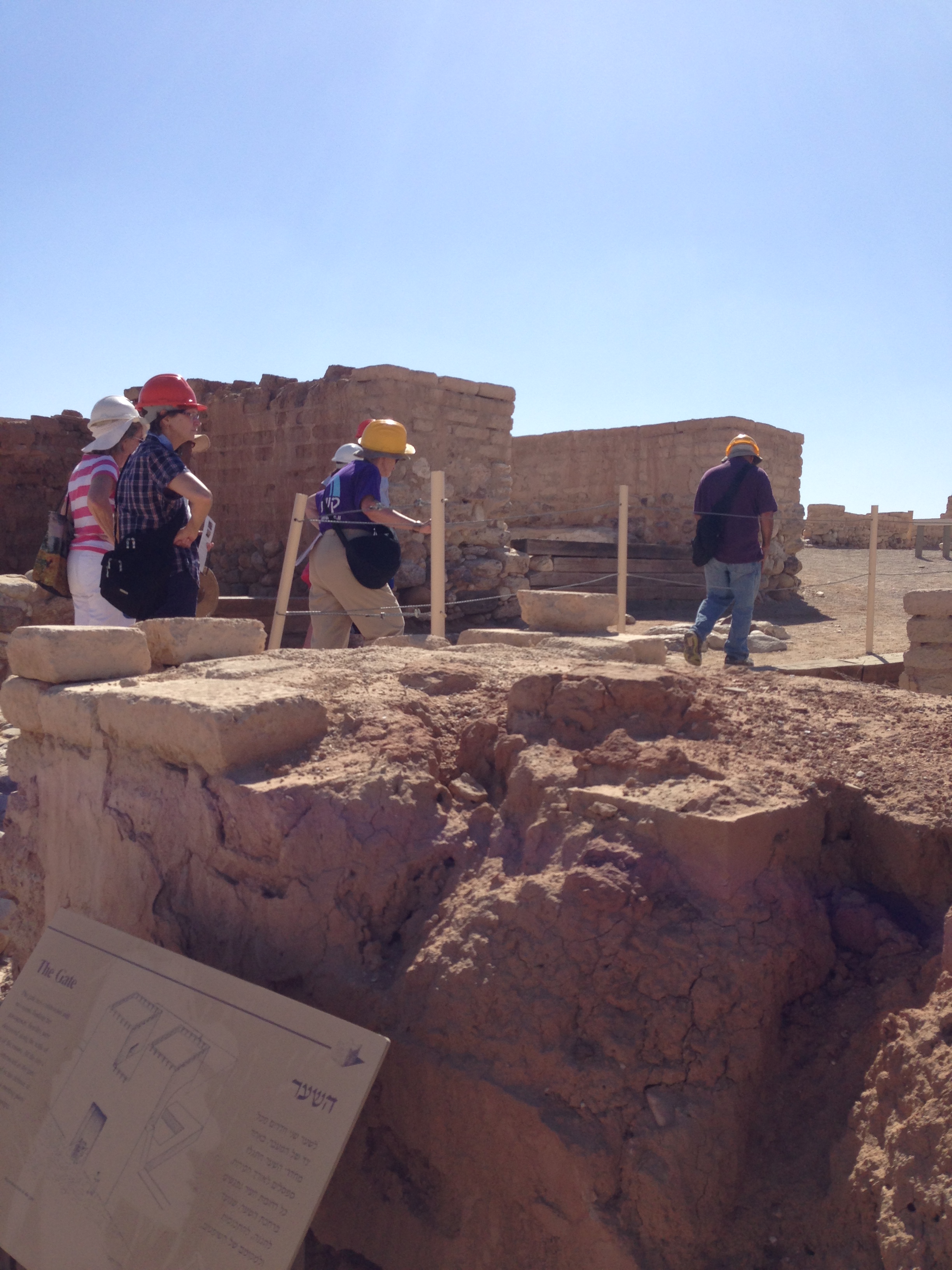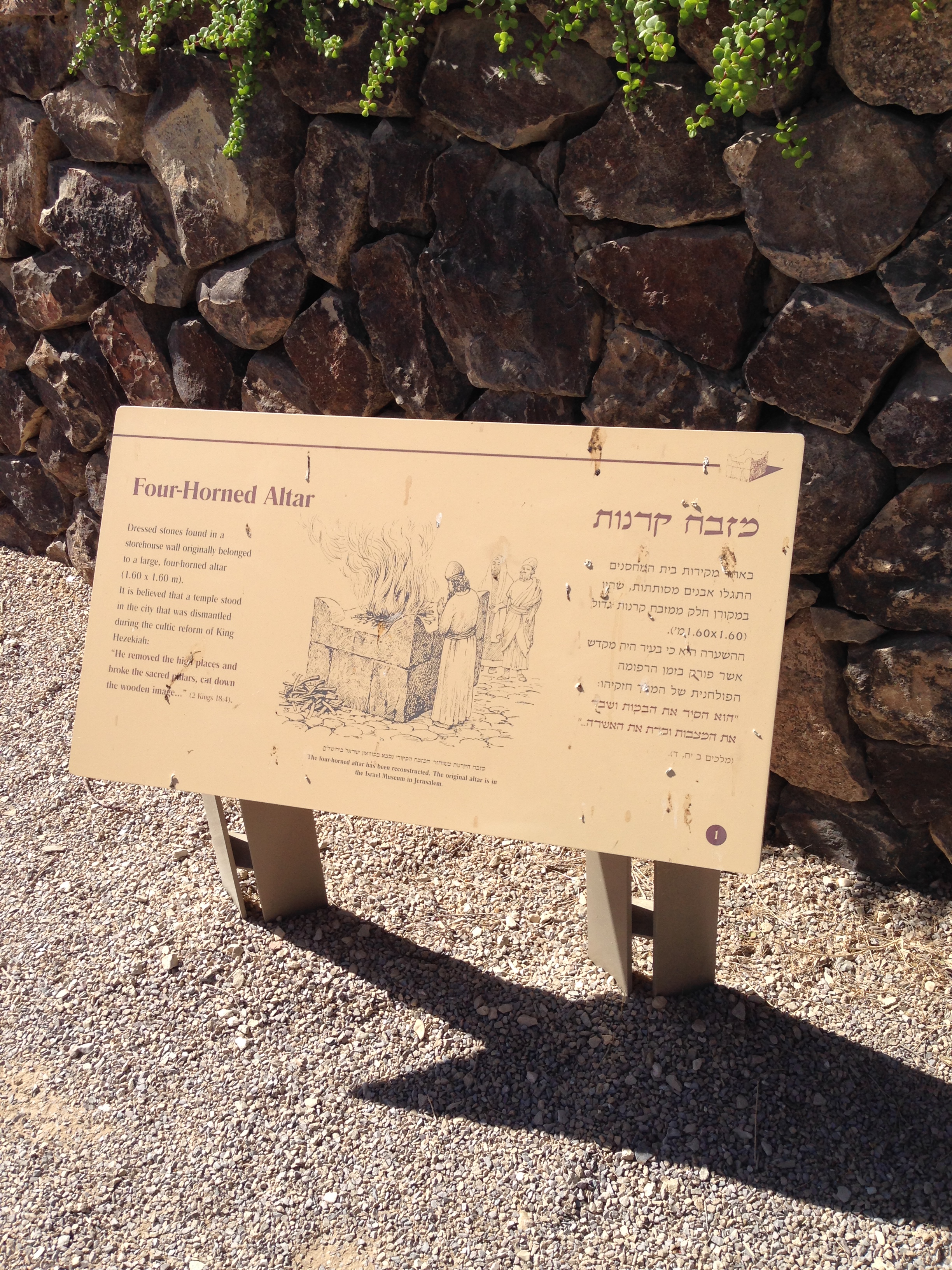 We got to Tel Be’er Sheva National Park – Remains of biblical Beersheba complete with the horned alter for animal sacrifice back in those days. Abraham’s well, which is over 70 meters deep is amazing as it’s important in our biblical stories. But the even more fascinating (to me) thing was the water system that was built complete with a super deep cistern. We climbed down the whole thing! It was actually cooler down there. How ever did they build a system lake that so long ago? We were there very near closing time for the park, so we were really lucky to get to go through it at all. But even better was the little discussion/study session we had regarding Genesis 12 and Genesis 18:25 and thoughts on why Abraham would leave where he was to go where there was no infrastructure, etc. to start a new lineage/people! A touch on the near sacrifice of Isaac came up with everyone’s sadness about the 3 teens that were recovered murdered and buried in a narrow grave, suspectedly by Hammas. I know my loved ones are worried about Michael and my safety being here during this difficult time and, I must admit, I do know it is a serious issue here. There is considerable extra alert. And I don’t believe anyone is better prepared to execute these alerts than Israel. But it is more sadness than anything else. Everyone is so sad. Thousands attended the funeral today of these boys. It’s so unacceptable for this to have happened. Here is more info on this National Park: http://www.attractions-in-israel.com/negev/negev-national-parks/tel-be%E2%80%99er-sheva-national-park-%E2%80%93-remains-of-biblical-beersheba/