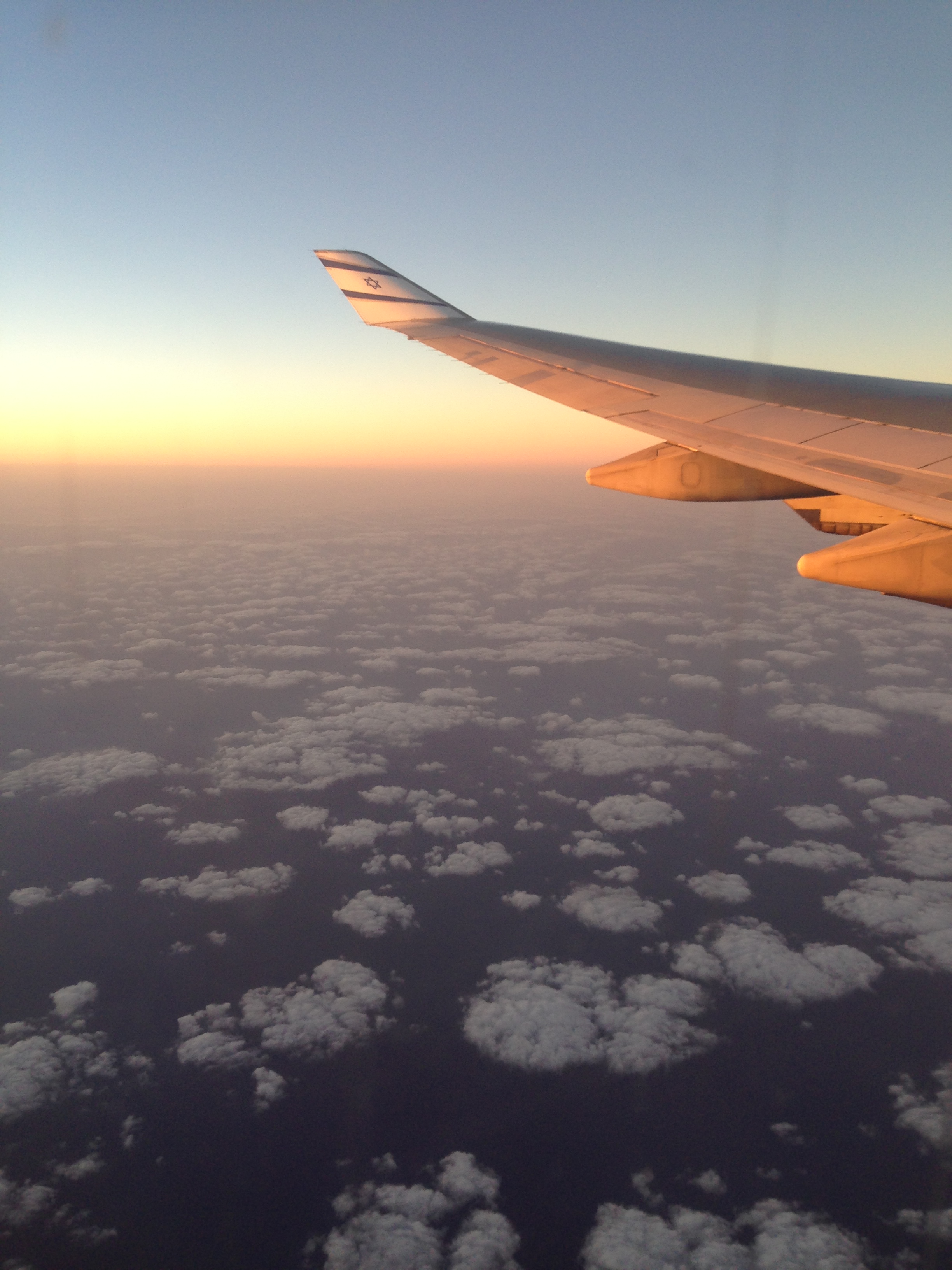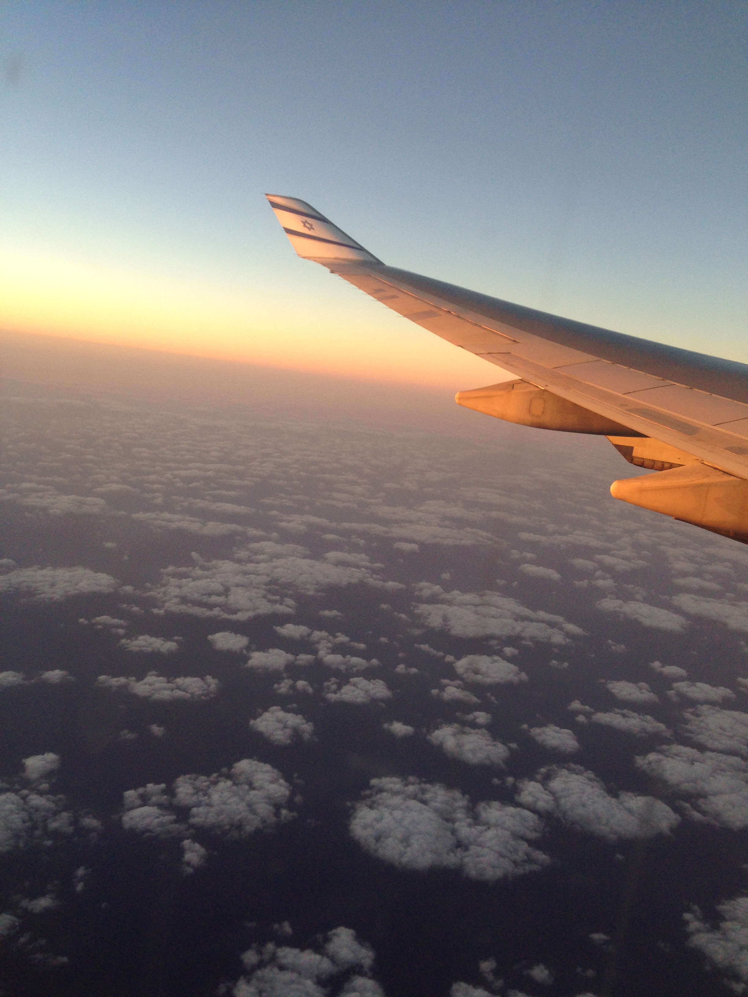I did enjoy a lovely view of sunset on the plane wing as we were descenting (hopefully picture below) and when I peered out the window, the upturn at the end of the plane wing was teh Israeli flag staring at me in the colorful sunset.