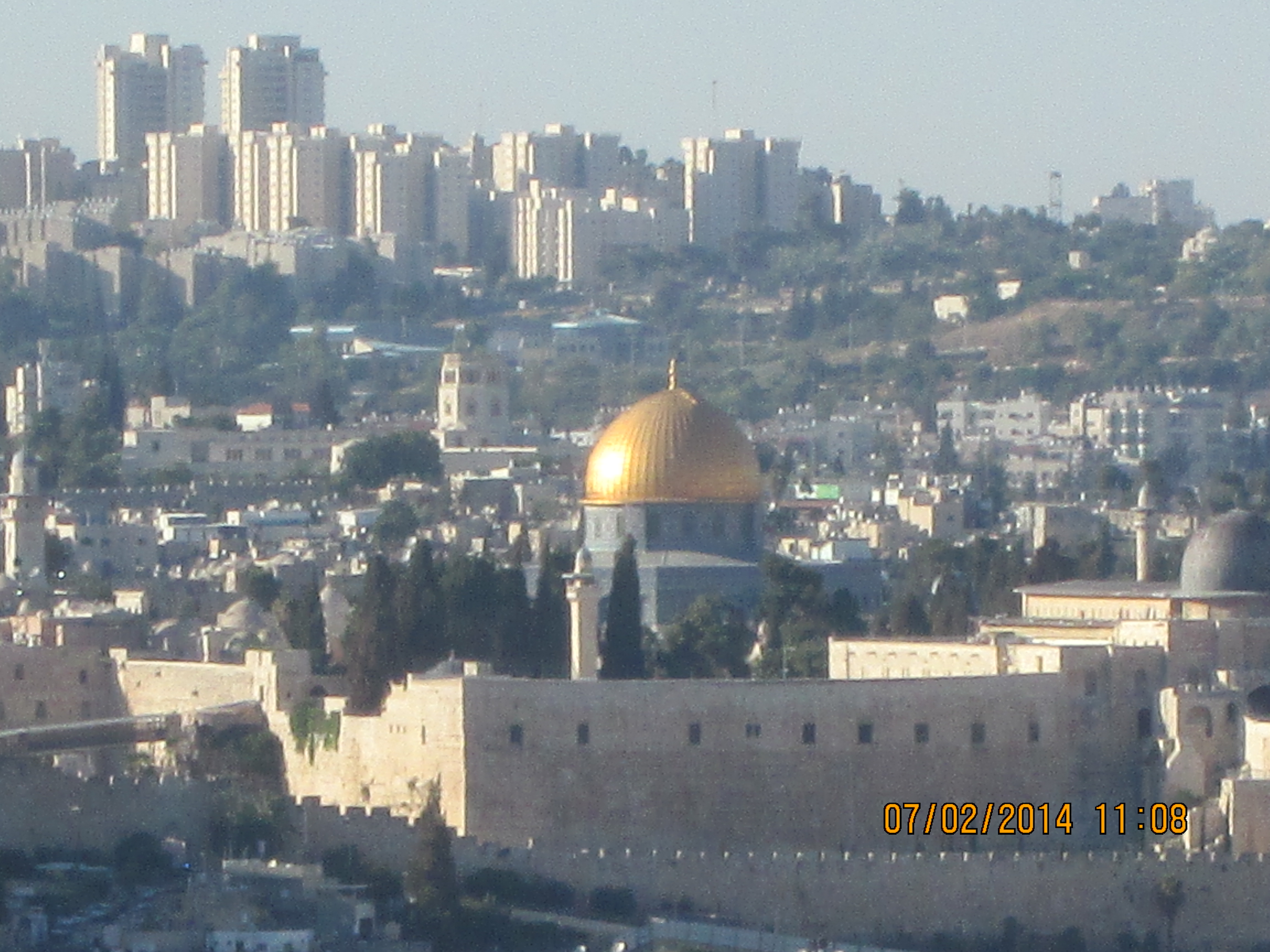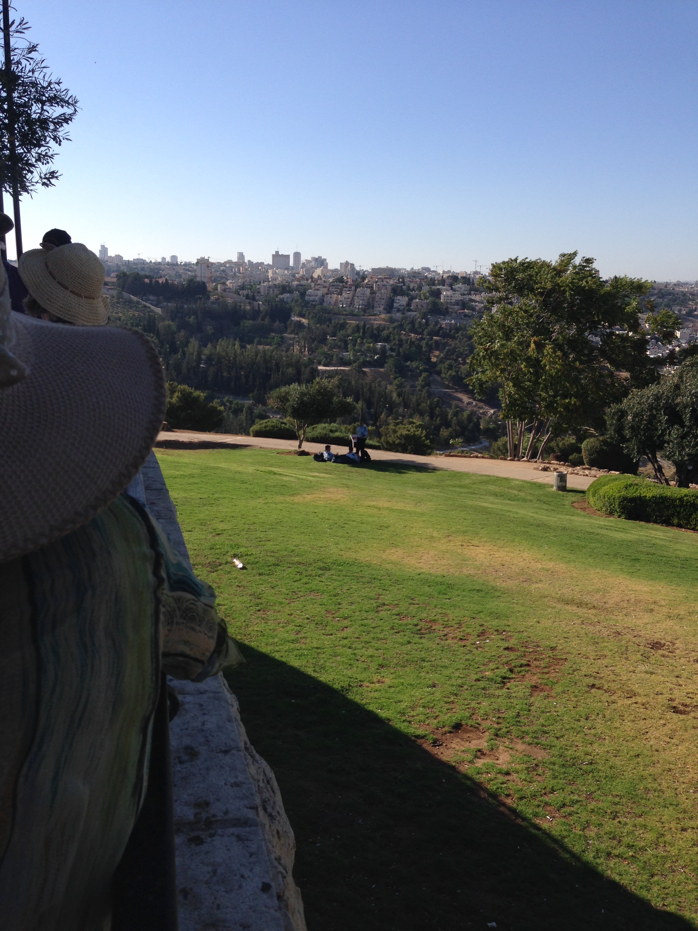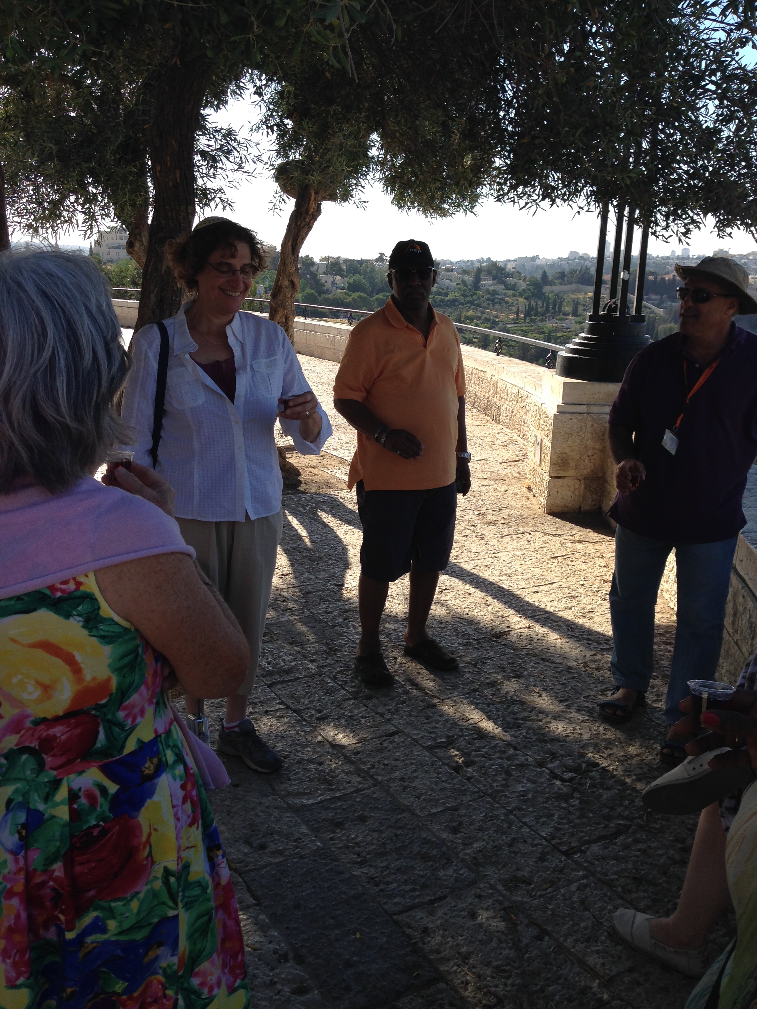 Another adjustment Amos made for us in light of the current situation is take us a day early to the Haas Promenade for a most beautiful scenic overlook of Jerusalem. I did get a nice picture or two from there and hope they are enjoyed (showing the Temple Mount, Dome of the Mosque, etc.). We said Shehecheyanu with Grape Juice together. If you don’t know this prayer, it is a basic STOP in your activity to toast together and thank God for allowing us to be together in this place…whatever the place, event or happening might be. http://en.wikipedia.org/wiki/Shehecheyanu It was very poignant for me as it was within hours of Amos having to tell us about the death of a young Palestinian boy. His announcement brought me immediately to quiet tears in our van. My “MOM” instincts kicked in and all I could think of was this boy’s Mom…no matter what else may or may not be involved or true regarding this whole incident. We now have 4 young boys…and they’re gone. And nothing that happened afterward will change that. All around us were groups of 4 or 5 police traveling together, but looking relaxed….just “being there”.