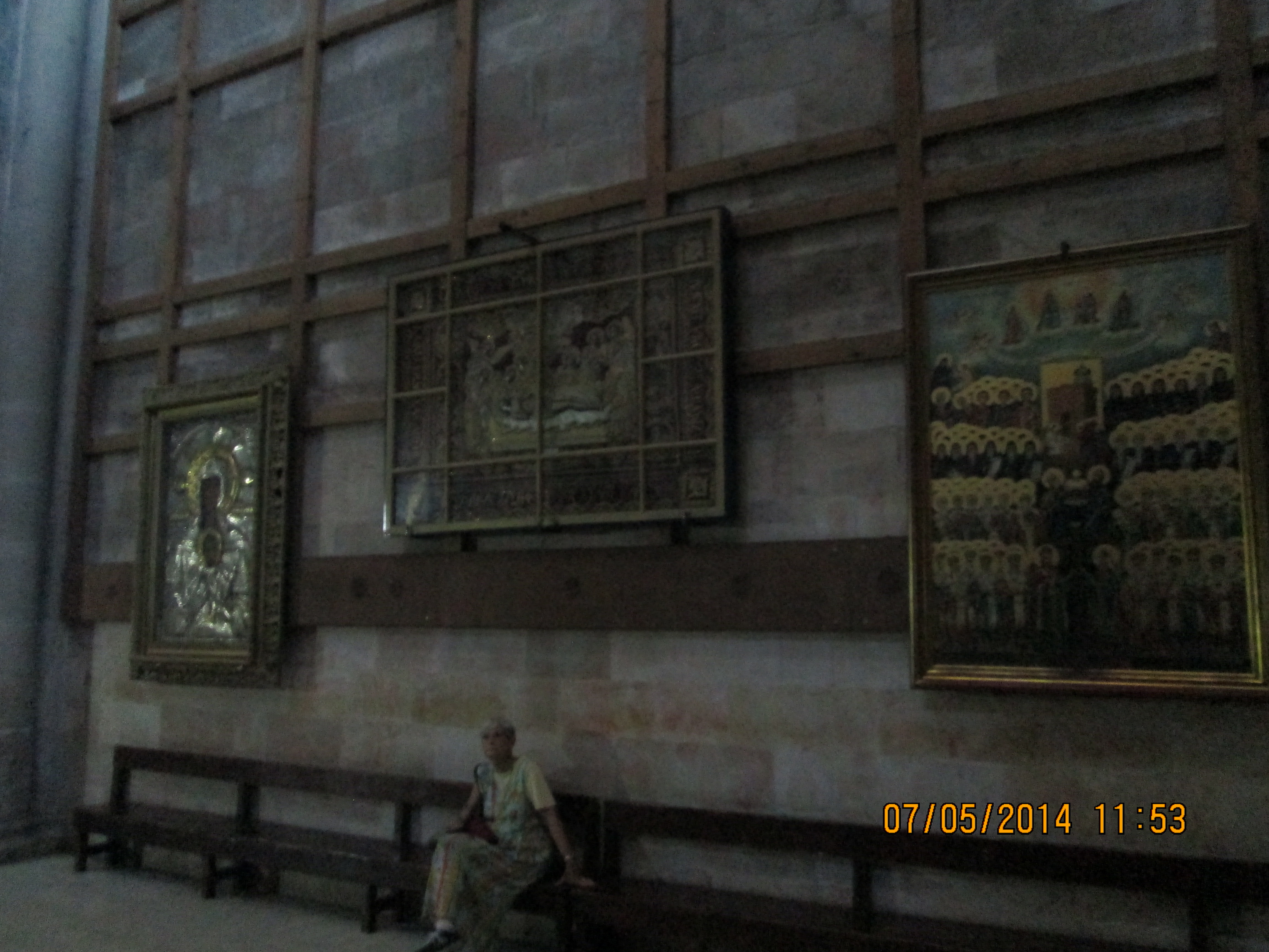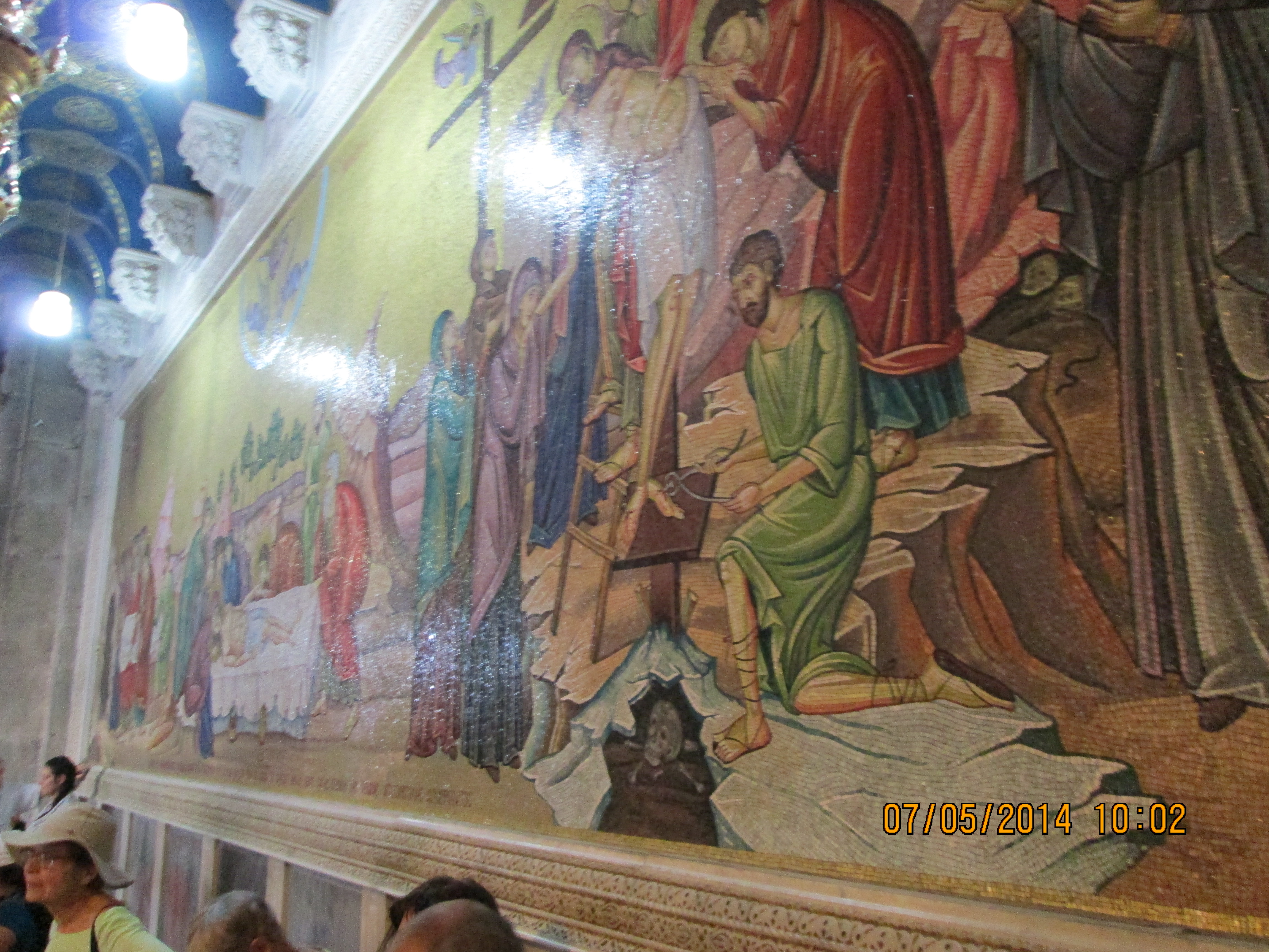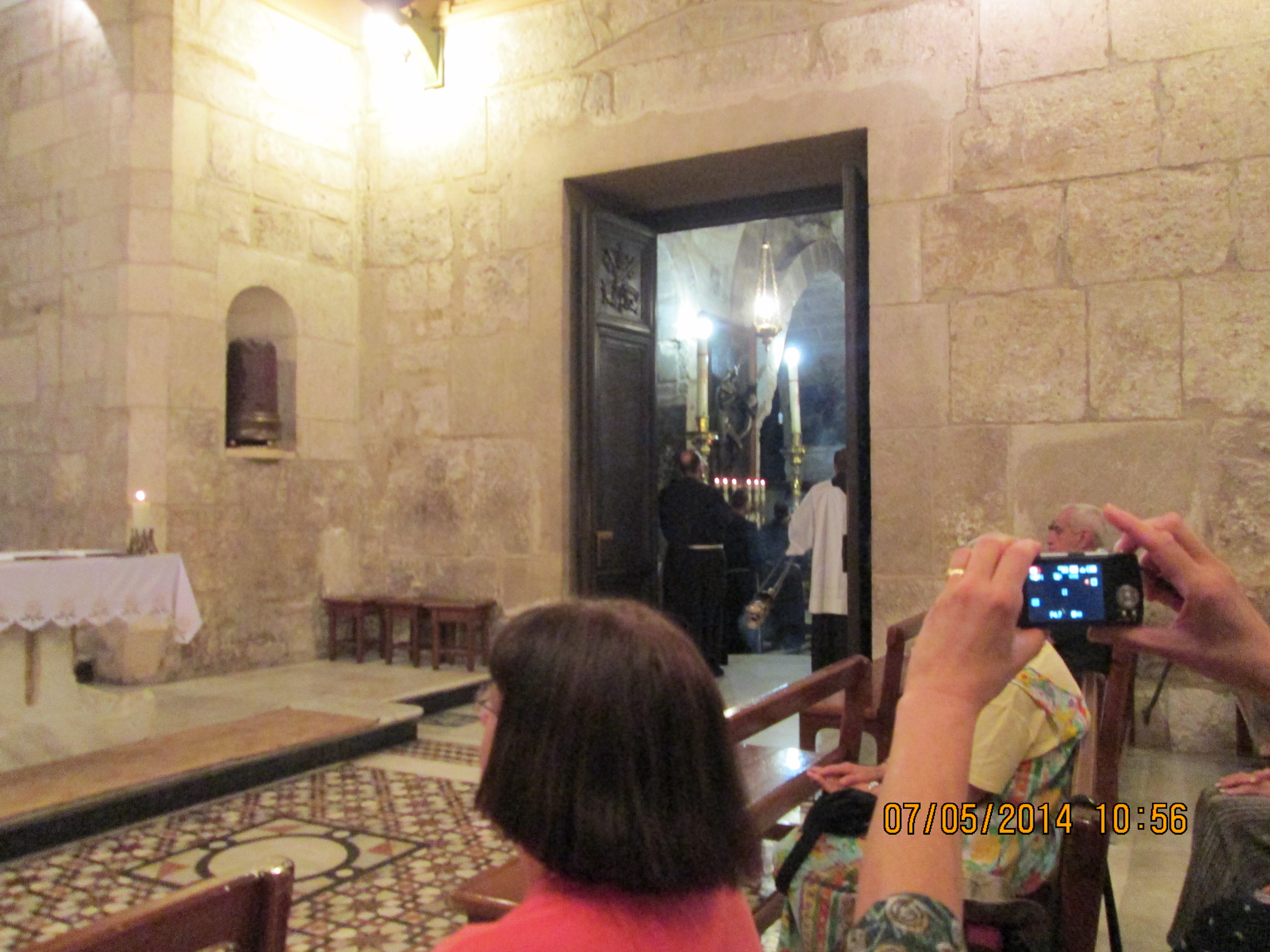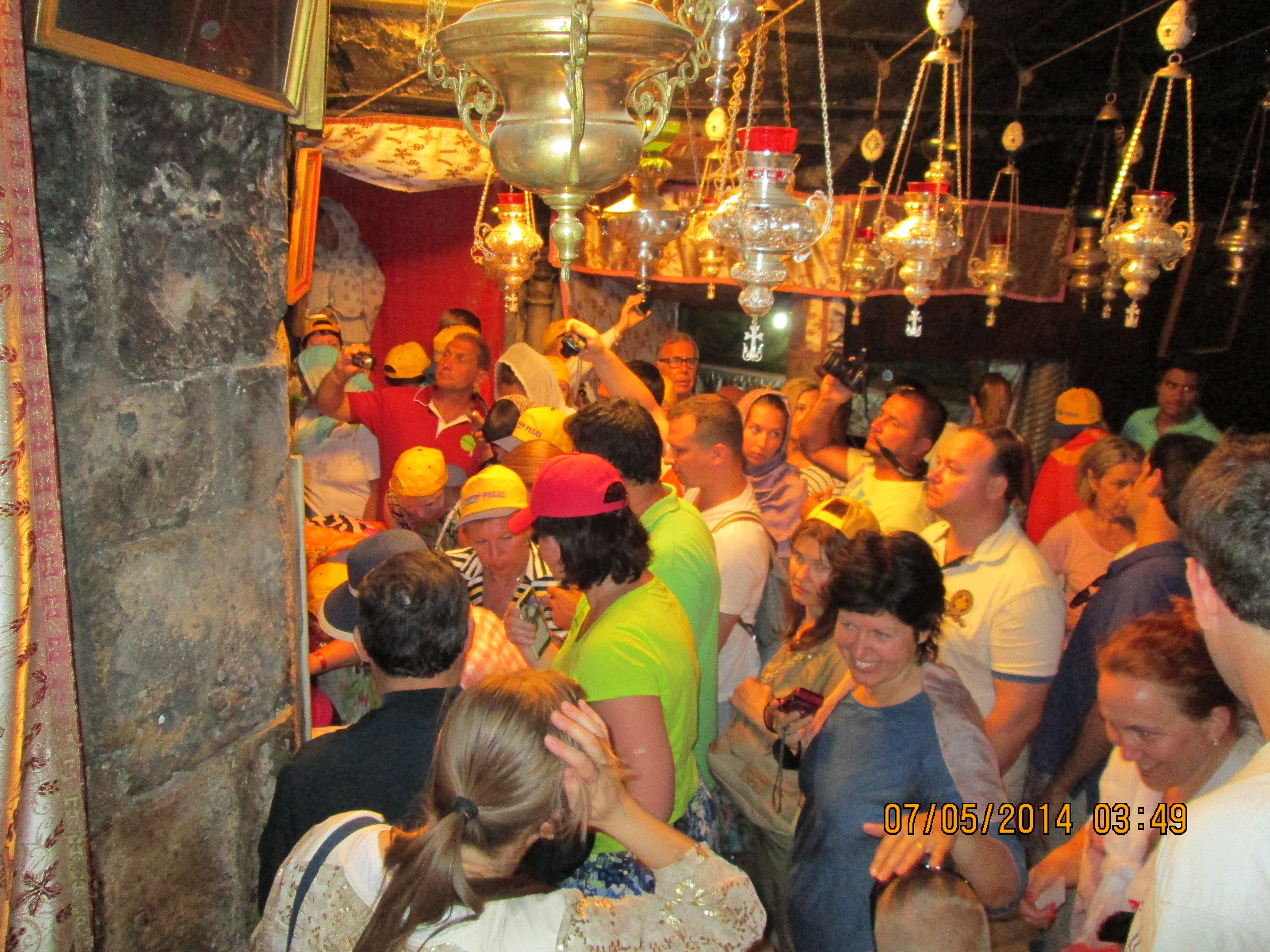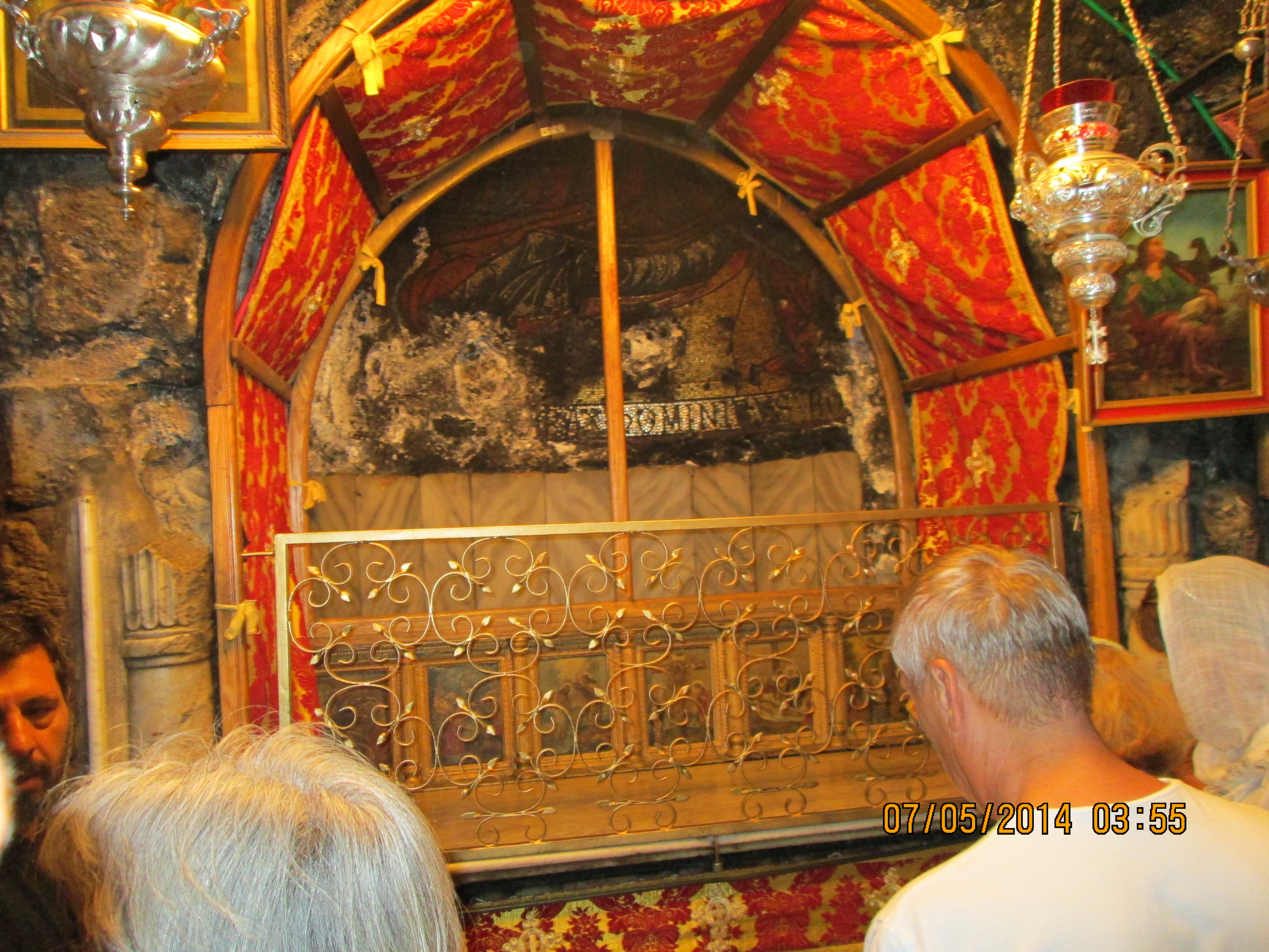 During a crusaders period restoration, the entry door was lowered to only 3 feet tall to prevent horse riding crusaders from riding through desecrating. We crawled in and I hoped/expected to be “wowed”….well, I was not wow’d, even though I was still very happy to be there. Our guide got us to line-jump to go down below to a very sacred nativity setting that the Greek Orthodox control (I think!); I went down and as long as I paid a donation, I was allowed to take a picture and see inside a miniature shrine that many literally were falling into and praying. Many more just sort of came in and came out. It was packed with bodies down there and anyone with claustrophobia need not be down there long! You’ll see in my pictures, the priest’s arm preventing my picture taking until he was sure I had given him a donation! Once he realized I had, he moved him arm and the next 2 pics of reddish lanterns, etc. are what I took. Then I looked up and took a pick of the cave-like structure we were actually in! Then I got out of there. While waiting for everyone else to get down and up, I did find tucked in some corners or by putting my camera through some caging, some lovely pics and frescoes, but, I must say they were not readily apparent due to all the scaffolding, etc.