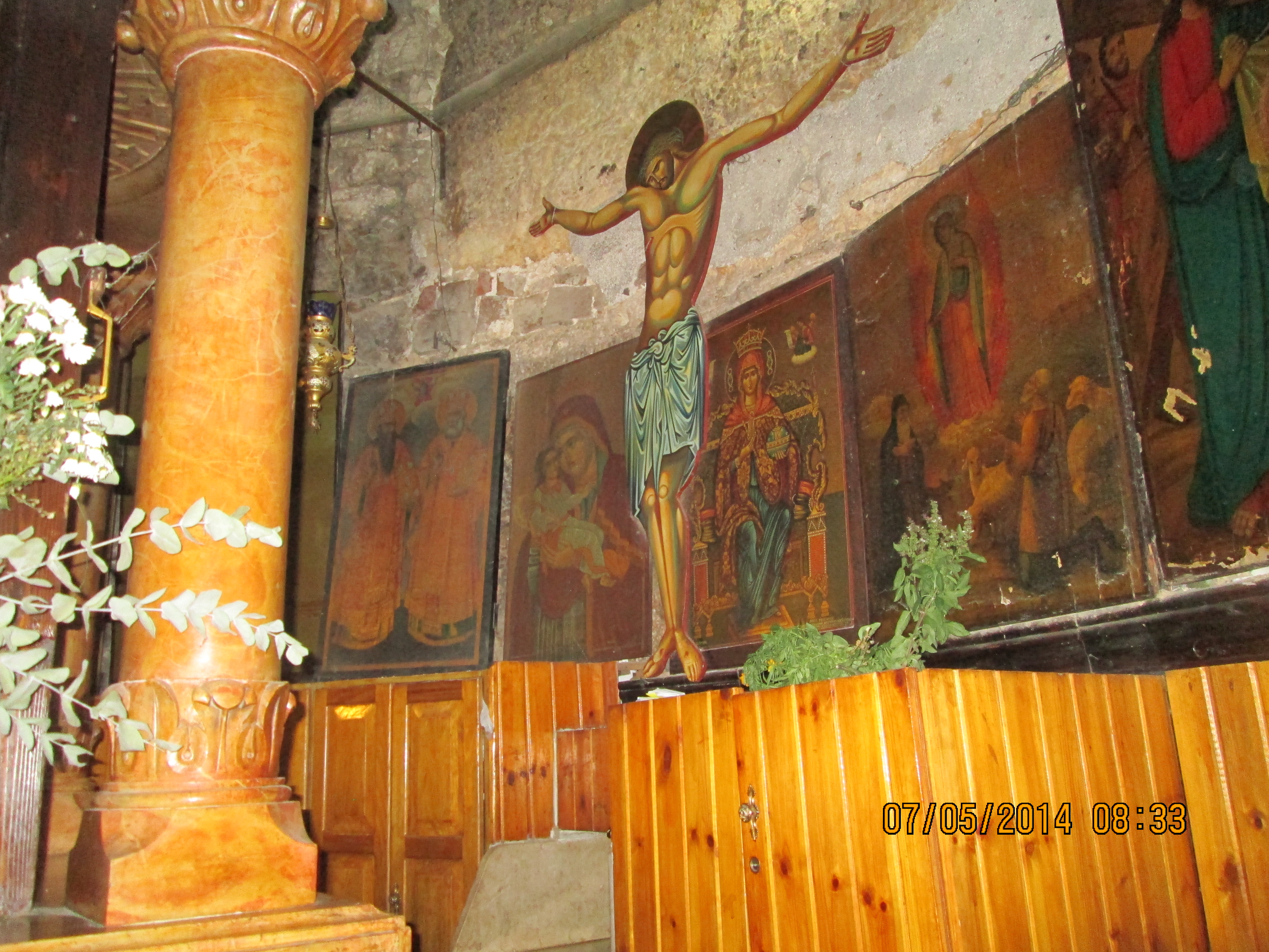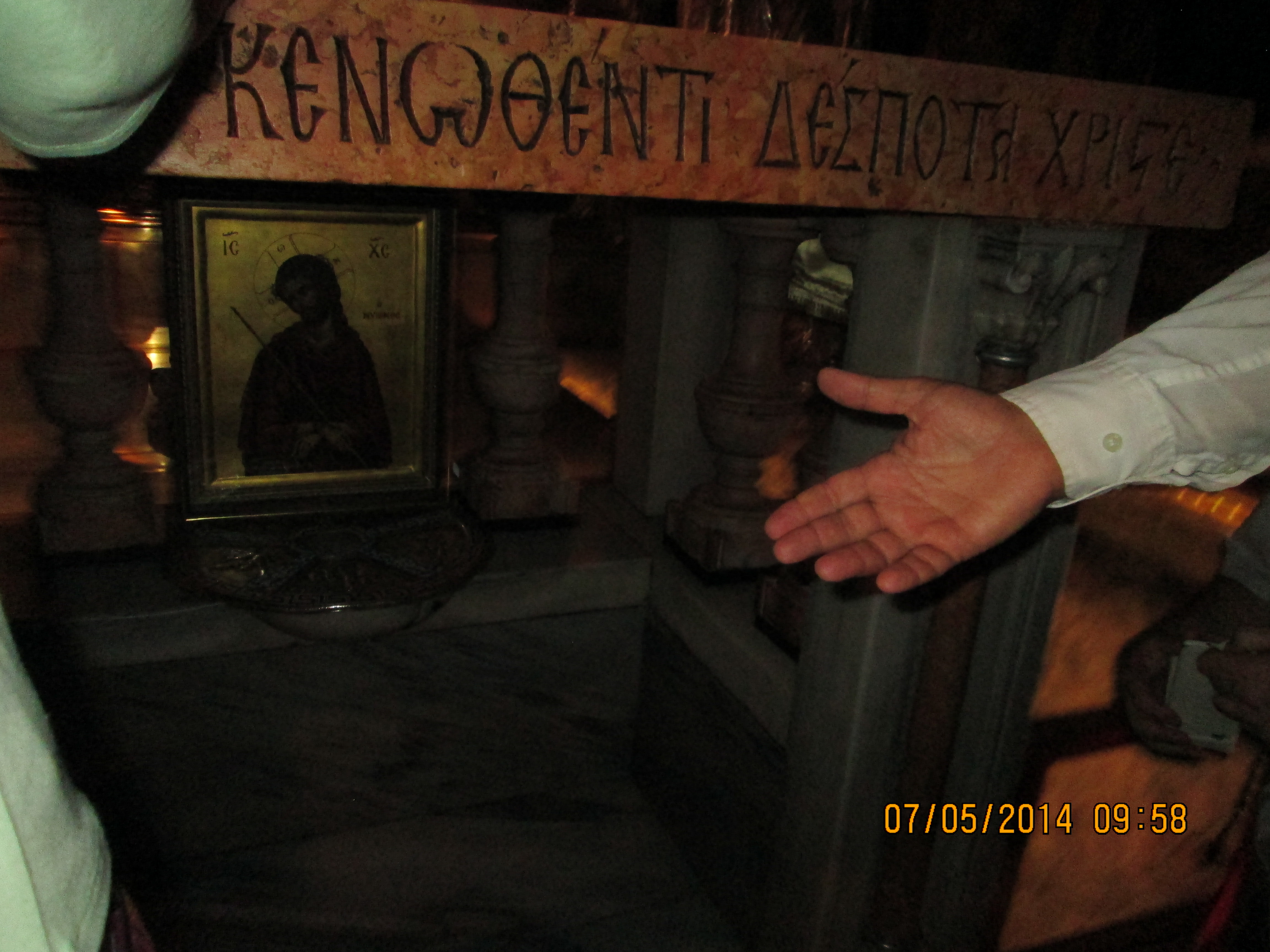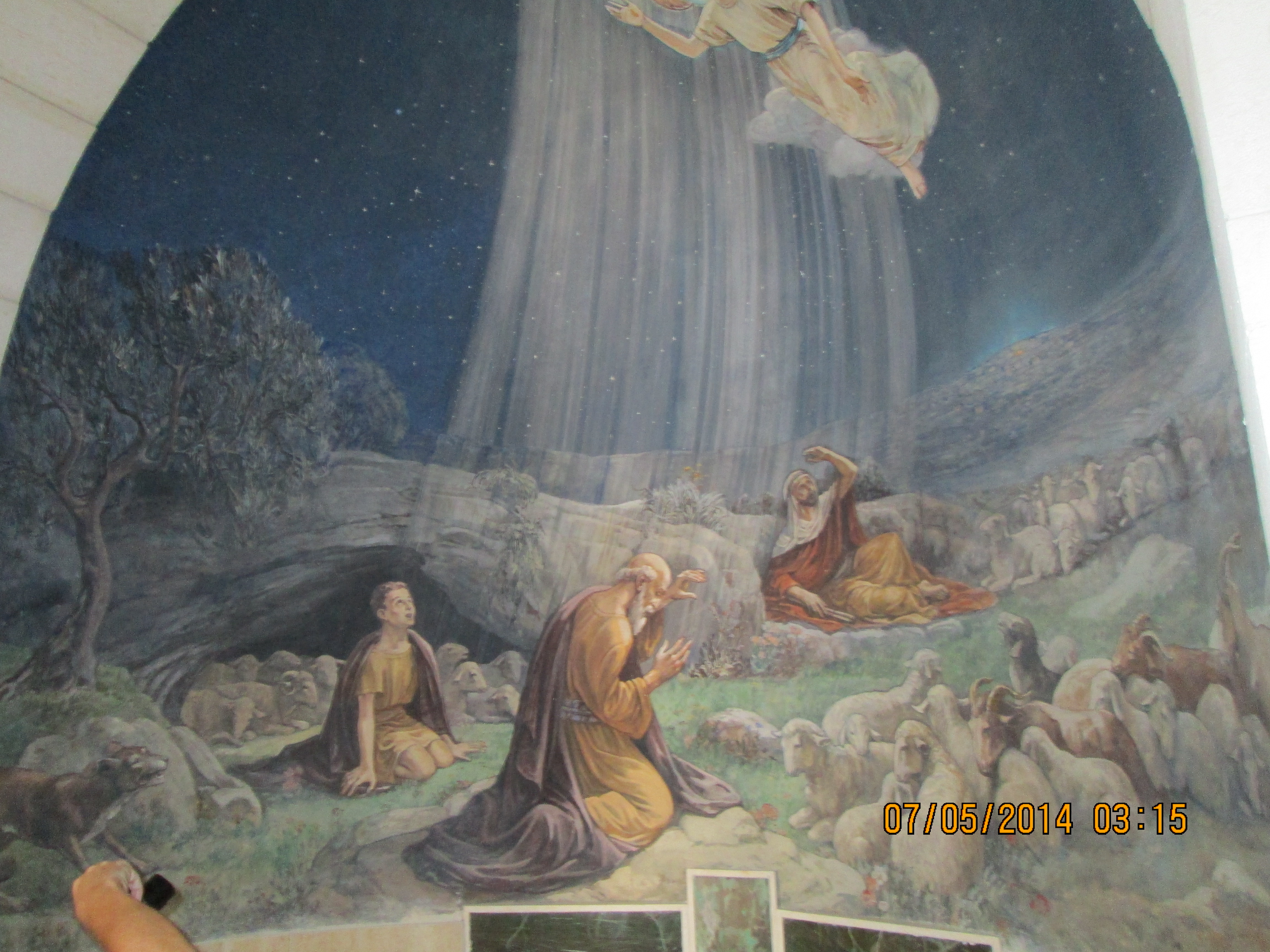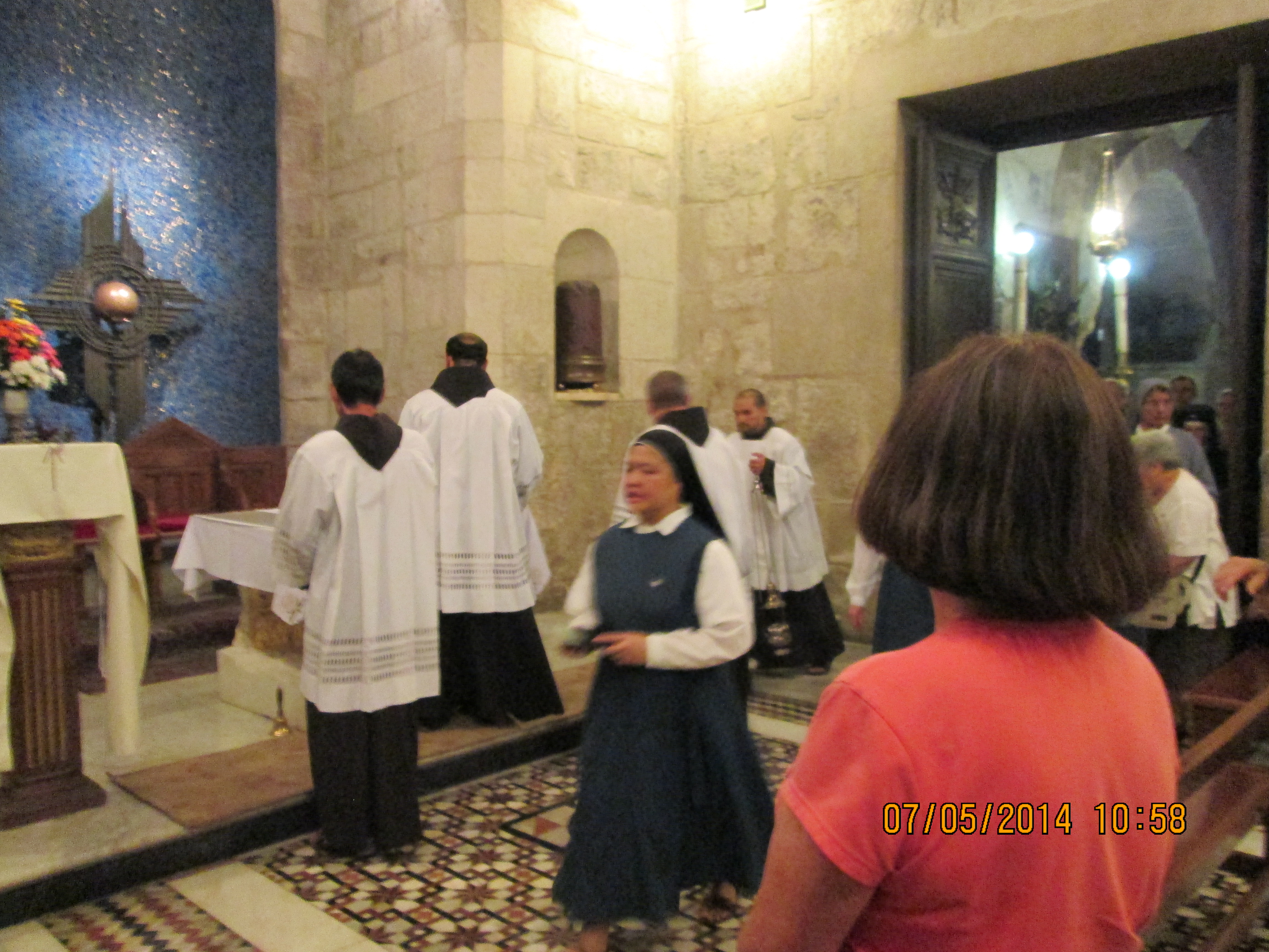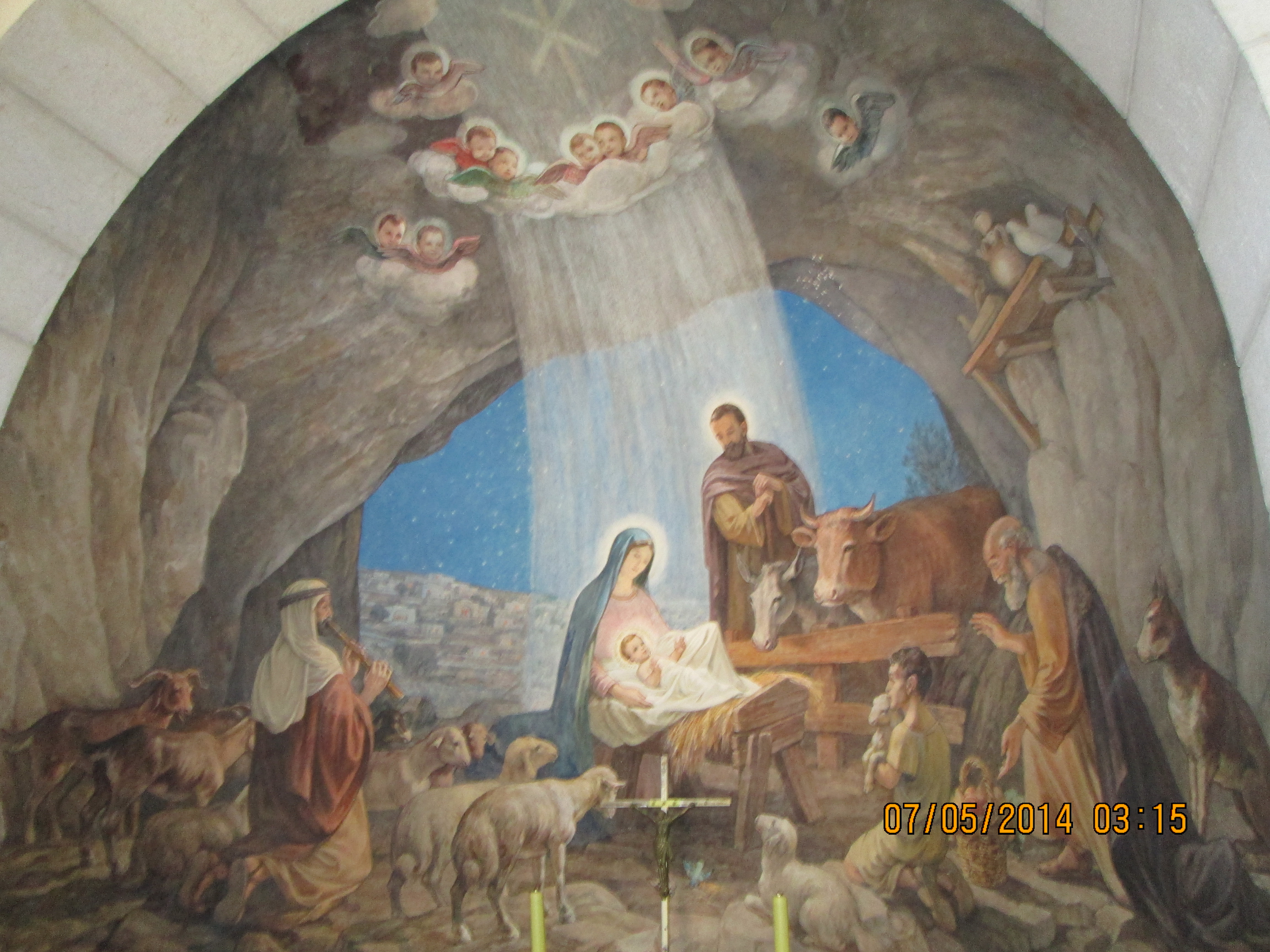During a crusaders period restoration, the entry door was lowered to only 3 feet tall to prevent horse riding crusaders from riding through desecrating. We crawled in and I hoped/expected to be “wowed”….well, I was not wow’d, even though I was still very happy to be there. Our guide got us to line-jump to go down below to a very sacred nativity setting that the Greek Orthodox control (I think!); I went down and as long as I paid a donation, I was allowed to take a picture and see inside a miniature shrine that many literally were falling into and praying. Many more just sort of came in and came out. It was packed with bodies down there and anyone with claustrophobia need not be down there long! You’ll see in my pictures, the priest’s arm preventing my picture taking until he was sure I had given him a donation! Once he realized I had, he moved him arm and the next 2 pics of reddish lanterns, etc. are what I took. Then I looked up and took a pick of the cave-like structure we were actually in! Then I got out of there. While waiting for everyone else to get down and up, I did find tucked in some corners or by putting my camera through some caging, some lovely pics and frescoes, but, I must say they were not readily apparent due to all the scaffolding, etc.
