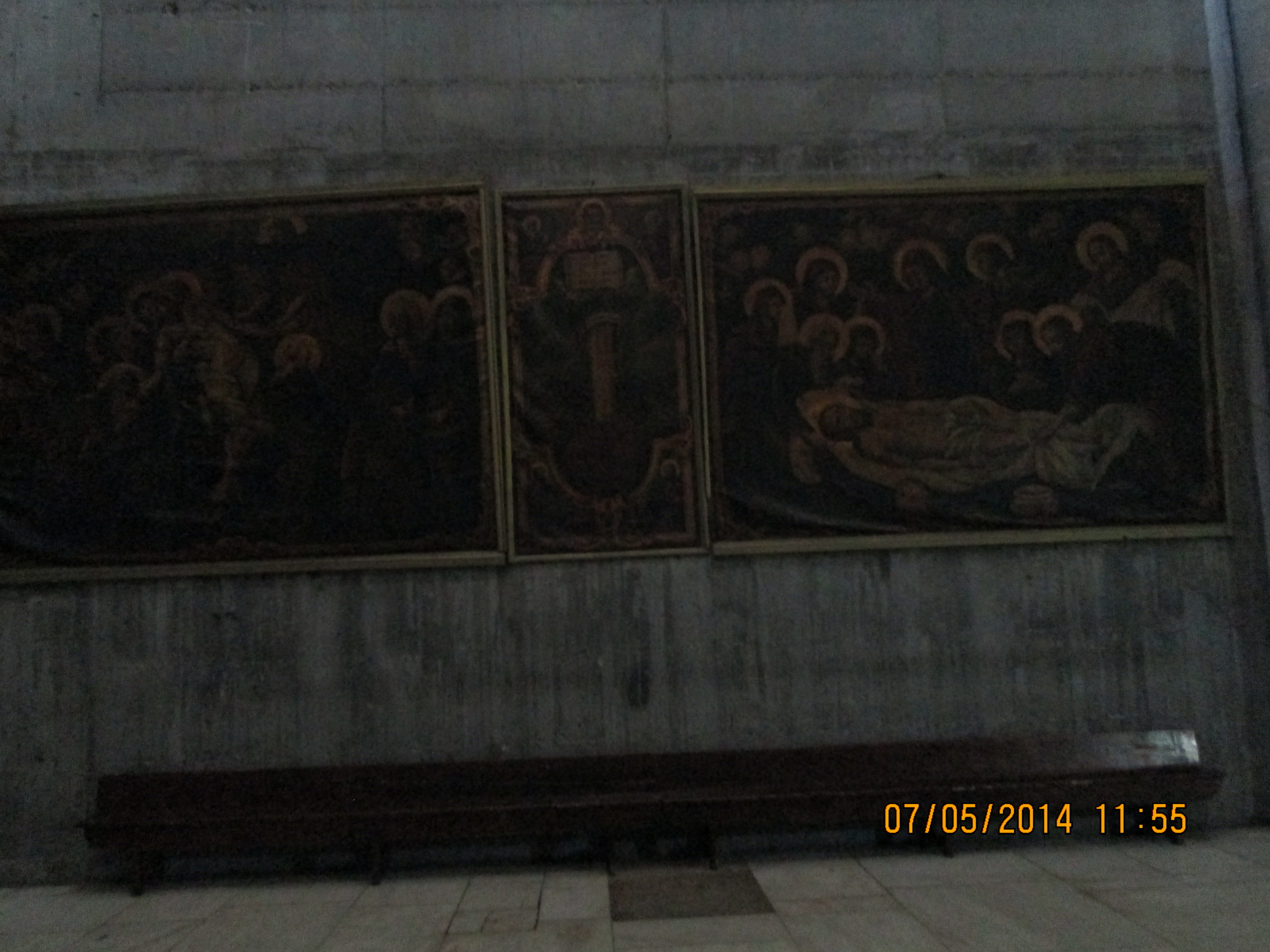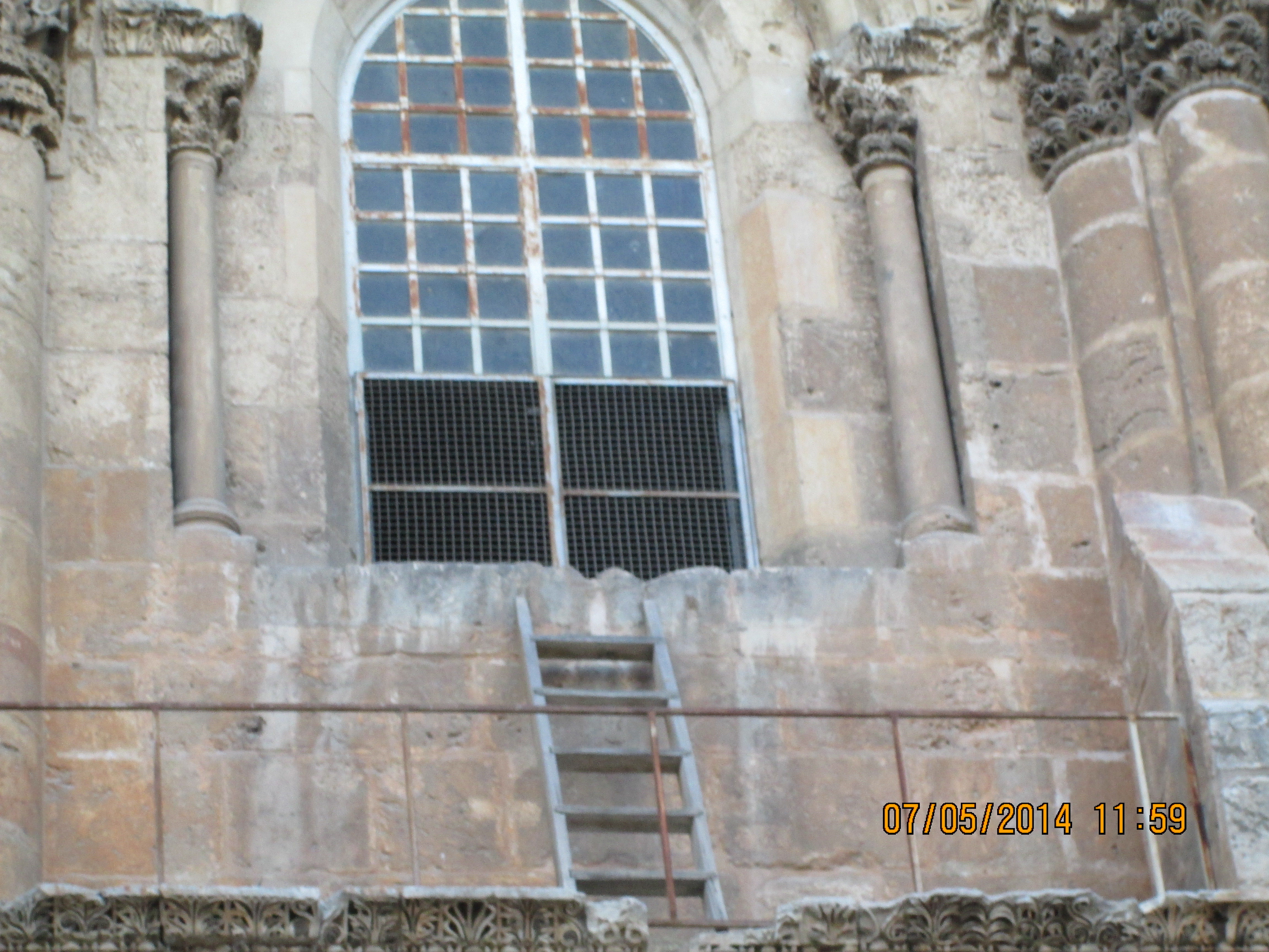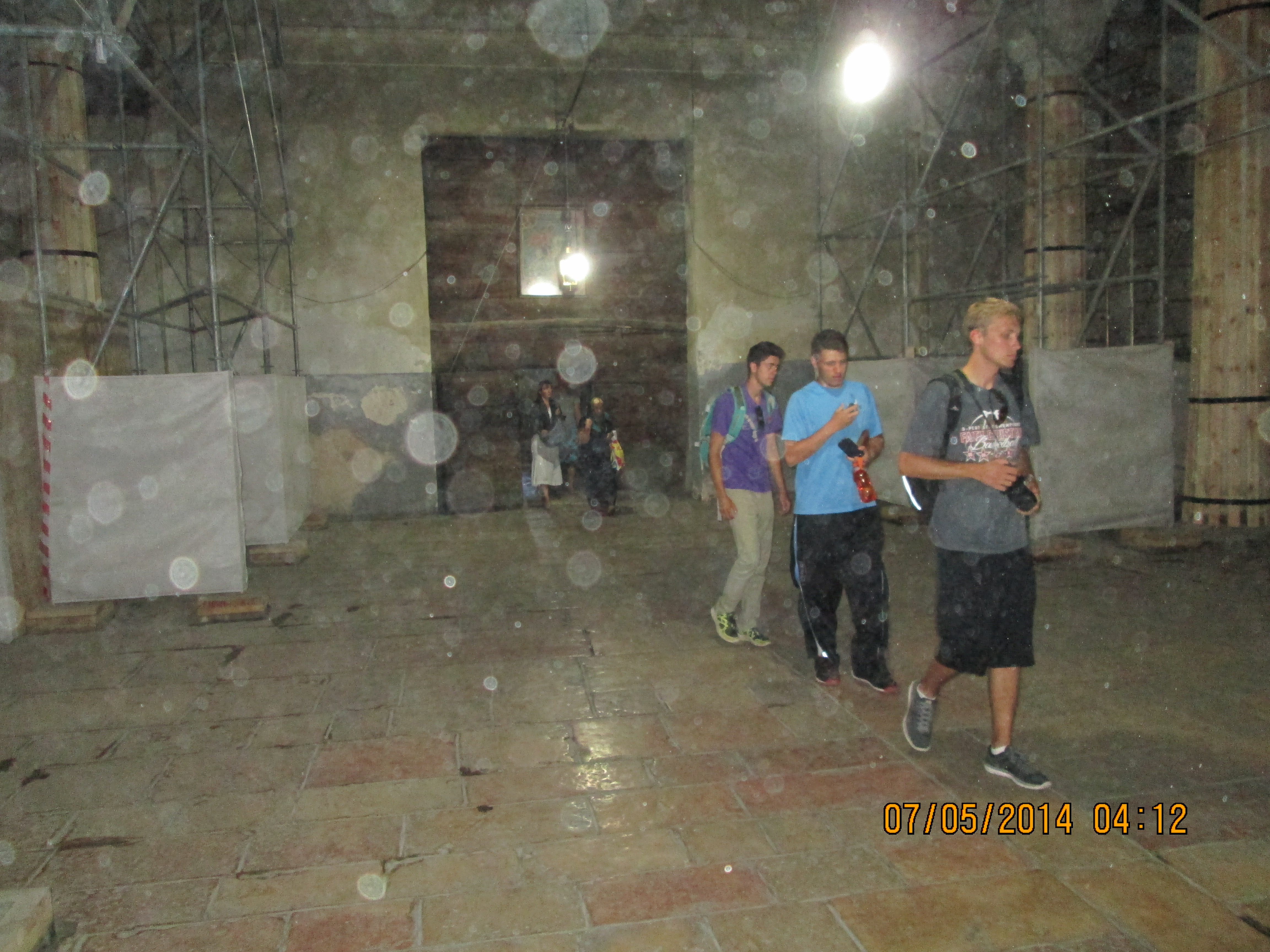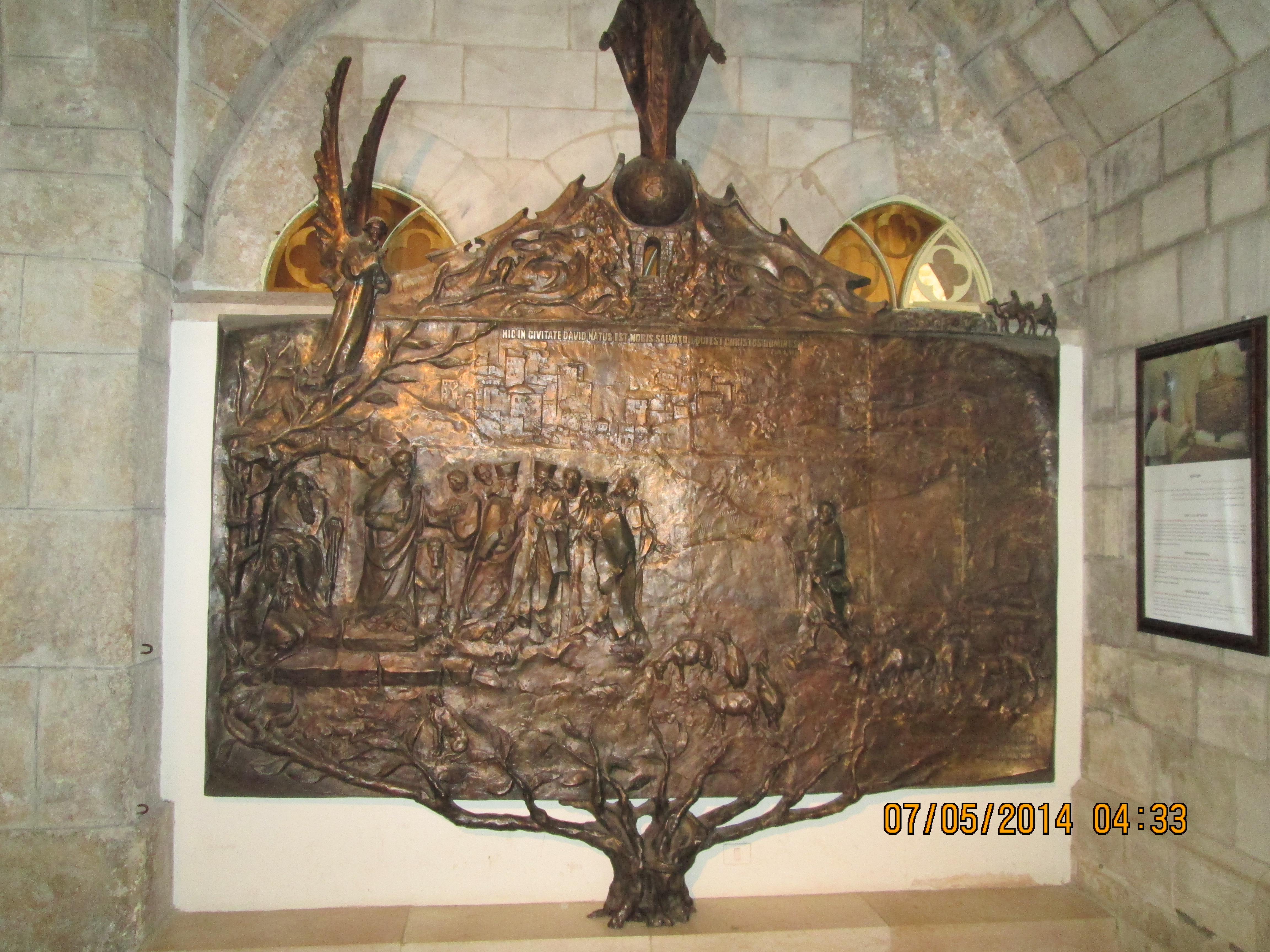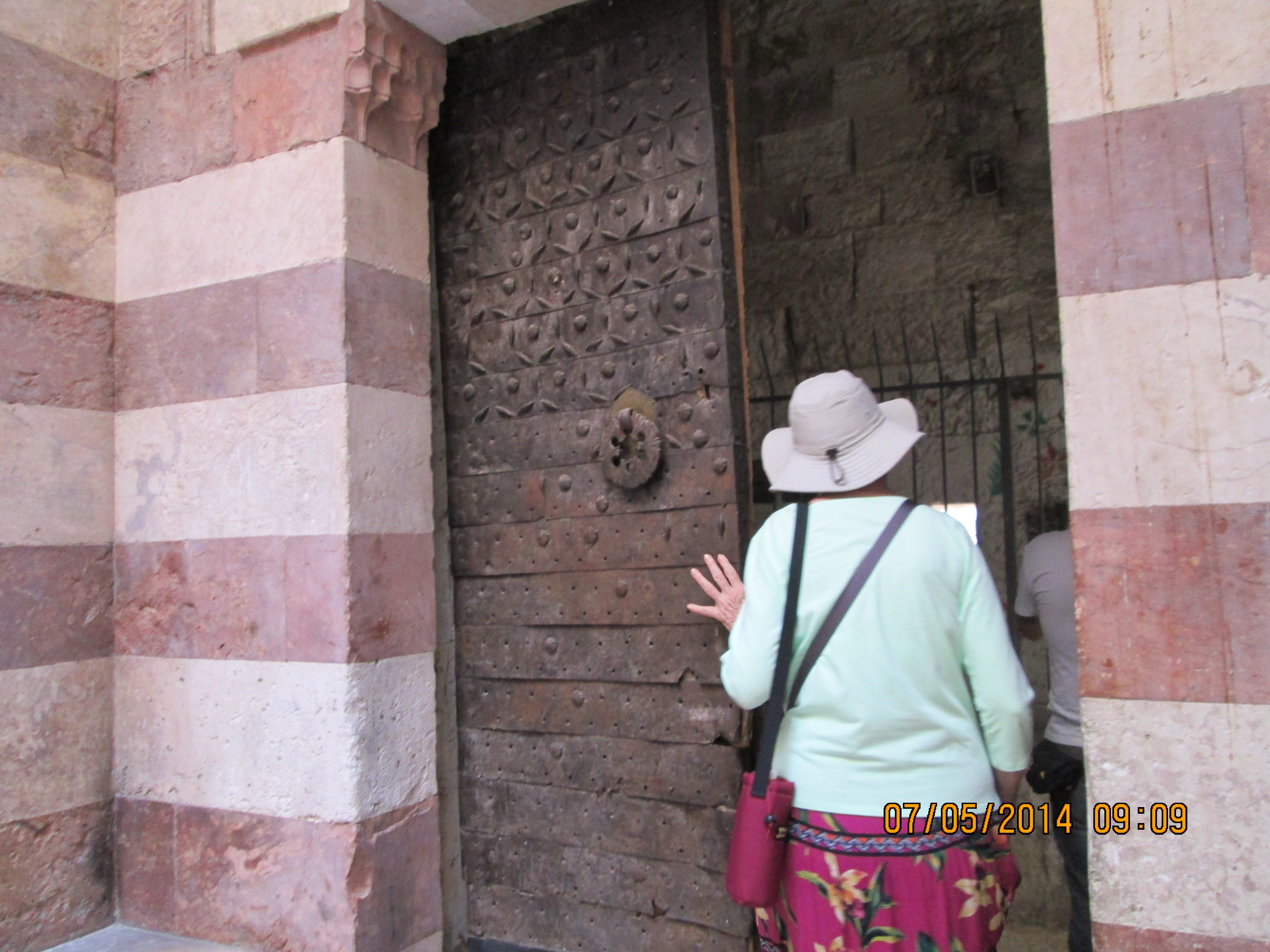 During a crusaders period restoration, the entry door was lowered to only 3 feet tall to prevent horse riding crusaders from riding through desecrating. We crawled in and I hoped/expected to be “wowed”….well, I was not wow’d, even though I was still very happy to be there. Our guide got us to line-jump to go down below to a very sacred nativity setting that the Greek Orthodox control (I think!); I went down and as long as I paid a donation, I was allowed to take a picture and see inside a miniature shrine that many literally were falling into and praying. Many more just sort of came in and came out. It was packed with bodies down there and anyone with claustrophobia need not be down there long! You’ll see in my pictures, the priest’s arm preventing my picture taking until he was sure I had given him a donation! Once he realized I had, he moved him arm and the next 2 pics of reddish lanterns, etc. are what I took. Then I looked up and took a pick of the cave-like structure we were actually in! Then I got out of there. While waiting for everyone else to get down and up, I did find tucked in some corners or by putting my camera through some caging, some lovely pics and frescoes, but, I must say they were not readily apparent due to all the scaffolding, etc.