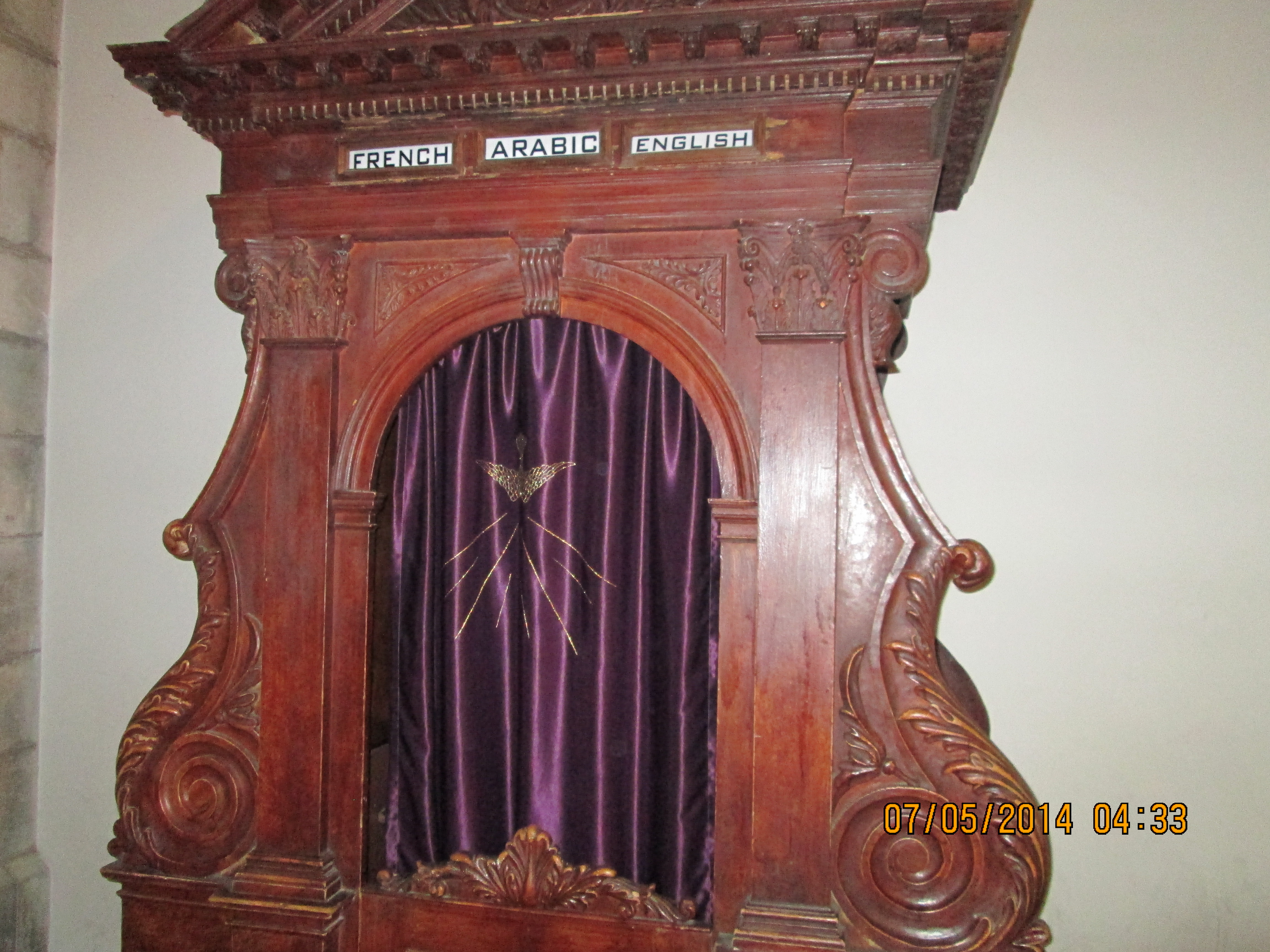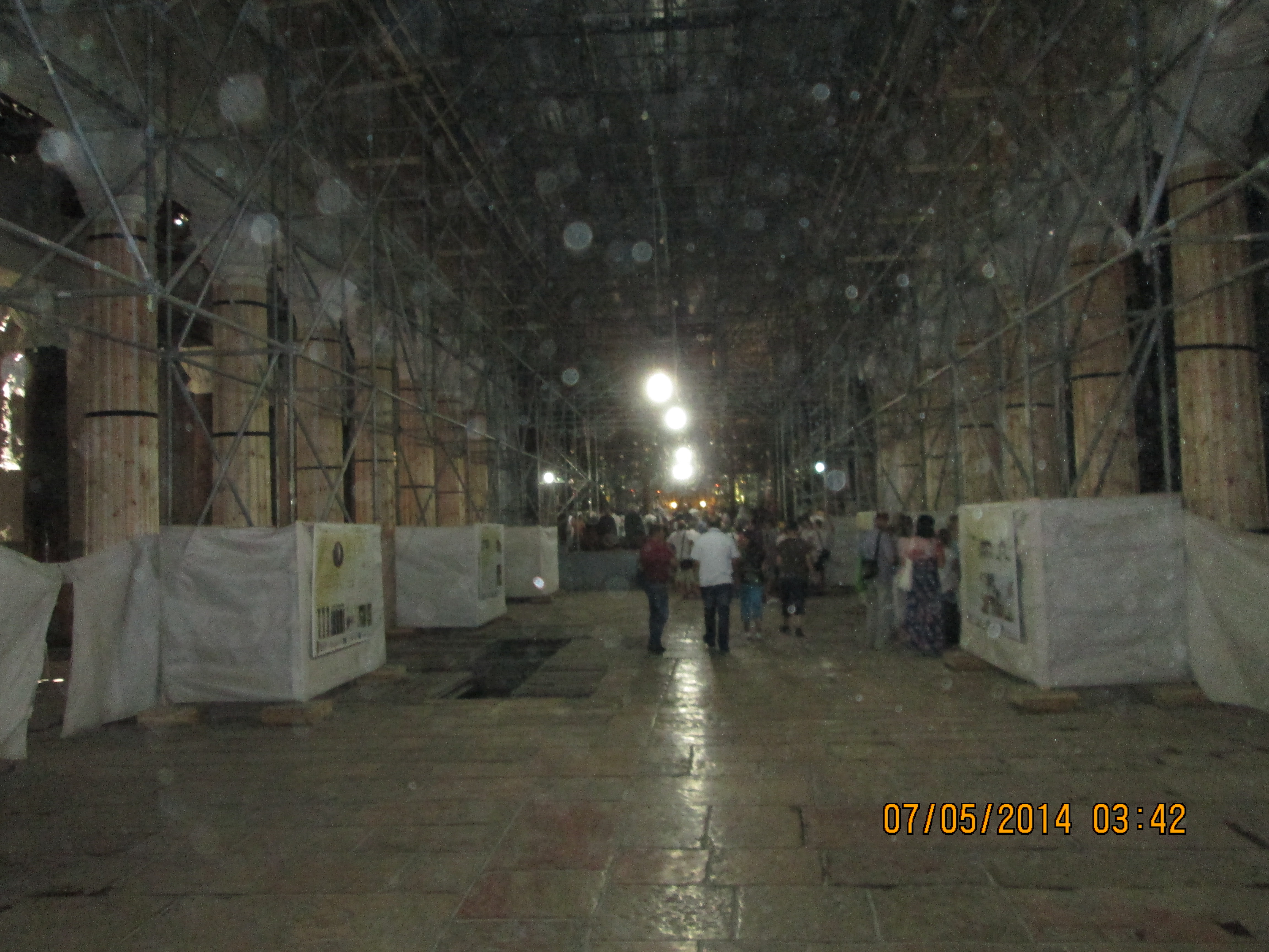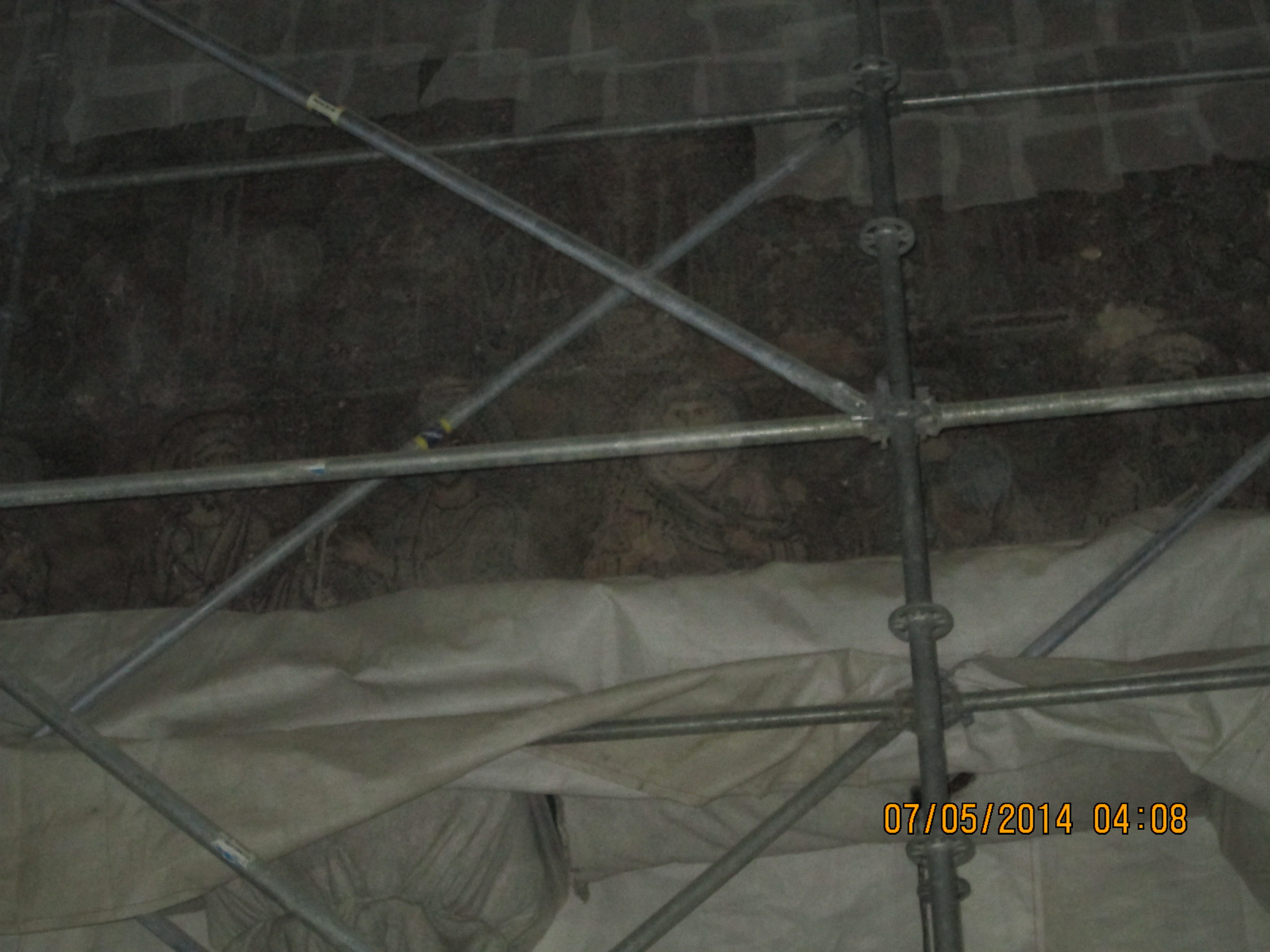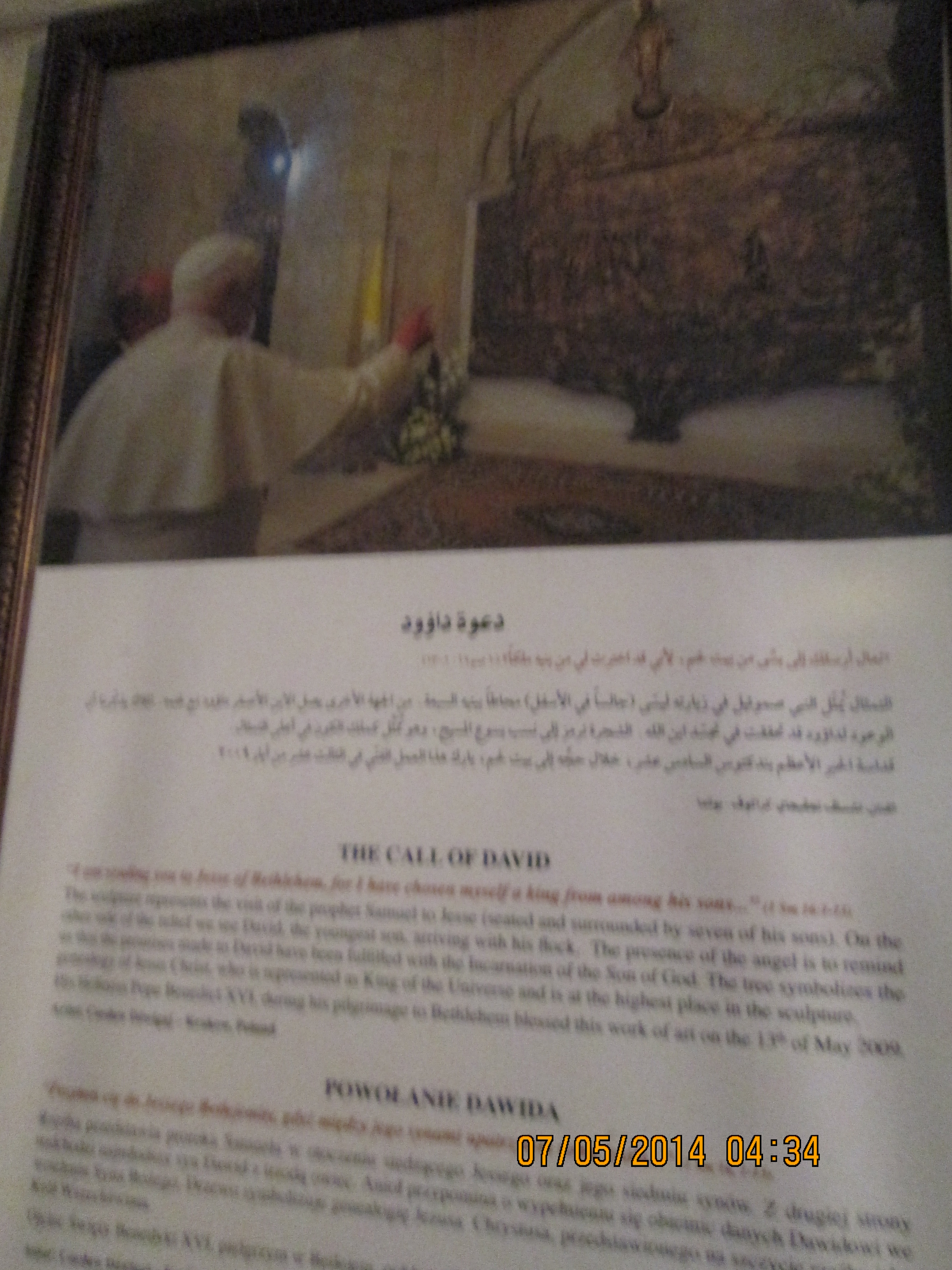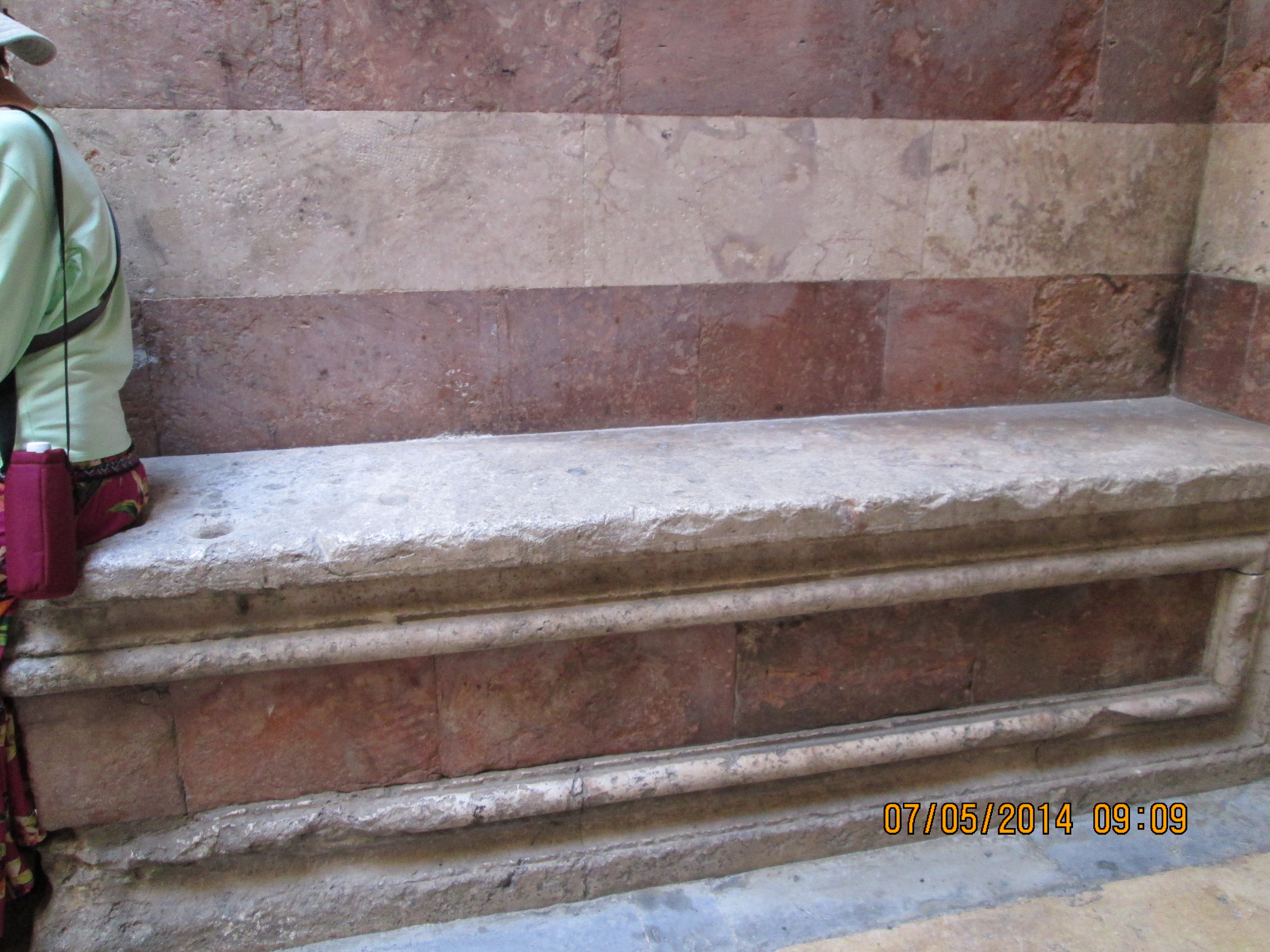 During a crusaders period restoration, the entry door was lowered to only 3 feet tall to prevent horse riding crusaders from riding through desecrating. We crawled in and I hoped/expected to be “wowed”….well, I was not wow’d, even though I was still very happy to be there. Our guide got us to line-jump to go down below to a very sacred nativity setting that the Greek Orthodox control (I think!); I went down and as long as I paid a donation, I was allowed to take a picture and see inside a miniature shrine that many literally were falling into and praying. Many more just sort of came in and came out. It was packed with bodies down there and anyone with claustrophobia need not be down there long! You’ll see in my pictures, the priest’s arm preventing my picture taking until he was sure I had given him a donation! Once he realized I had, he moved him arm and the next 2 pics of reddish lanterns, etc. are what I took. Then I looked up and took a pick of the cave-like structure we were actually in! Then I got out of there. While waiting for everyone else to get down and up, I did find tucked in some corners or by putting my camera through some caging, some lovely pics and frescoes, but, I must say they were not readily apparent due to all the scaffolding, etc.