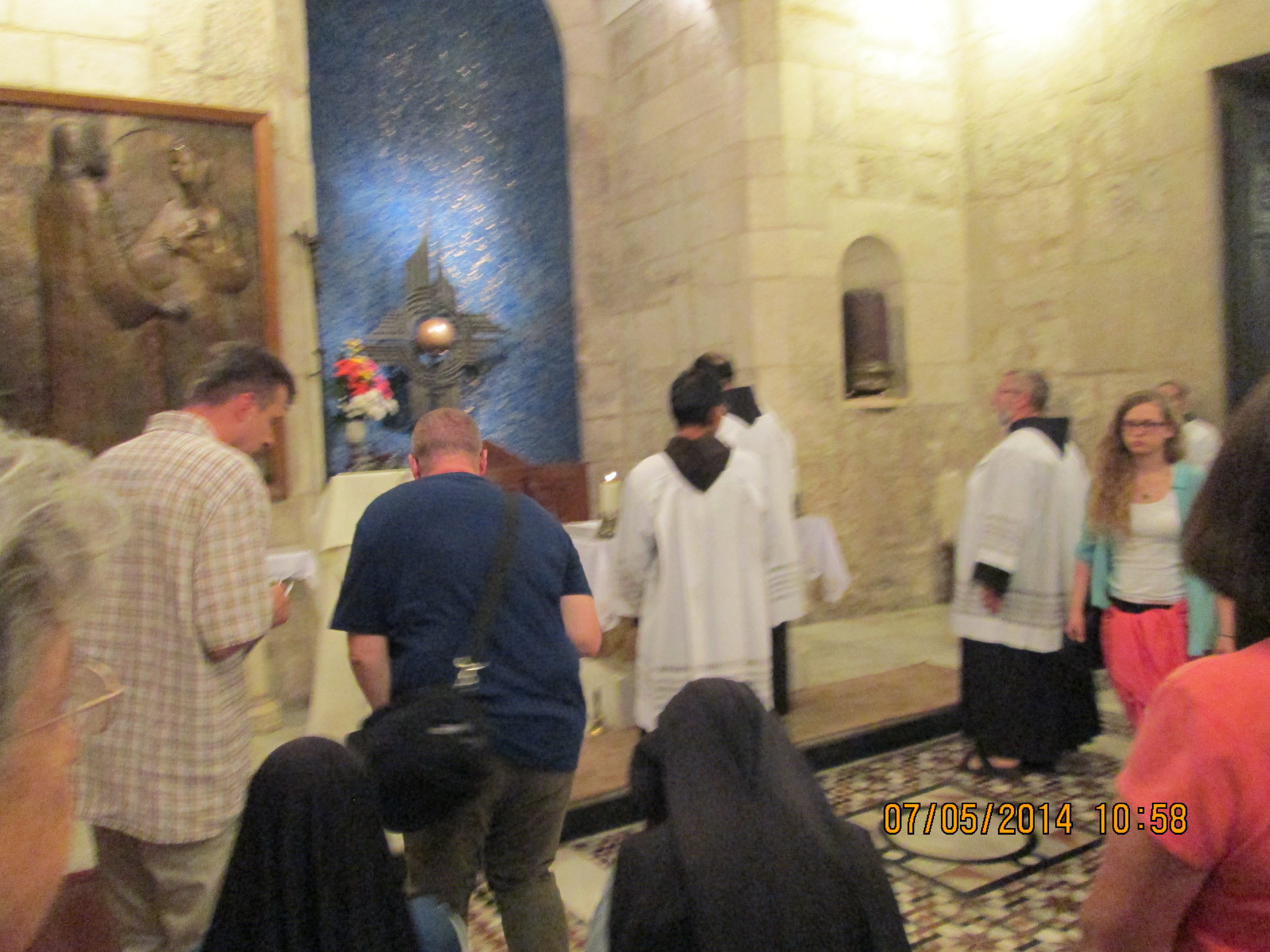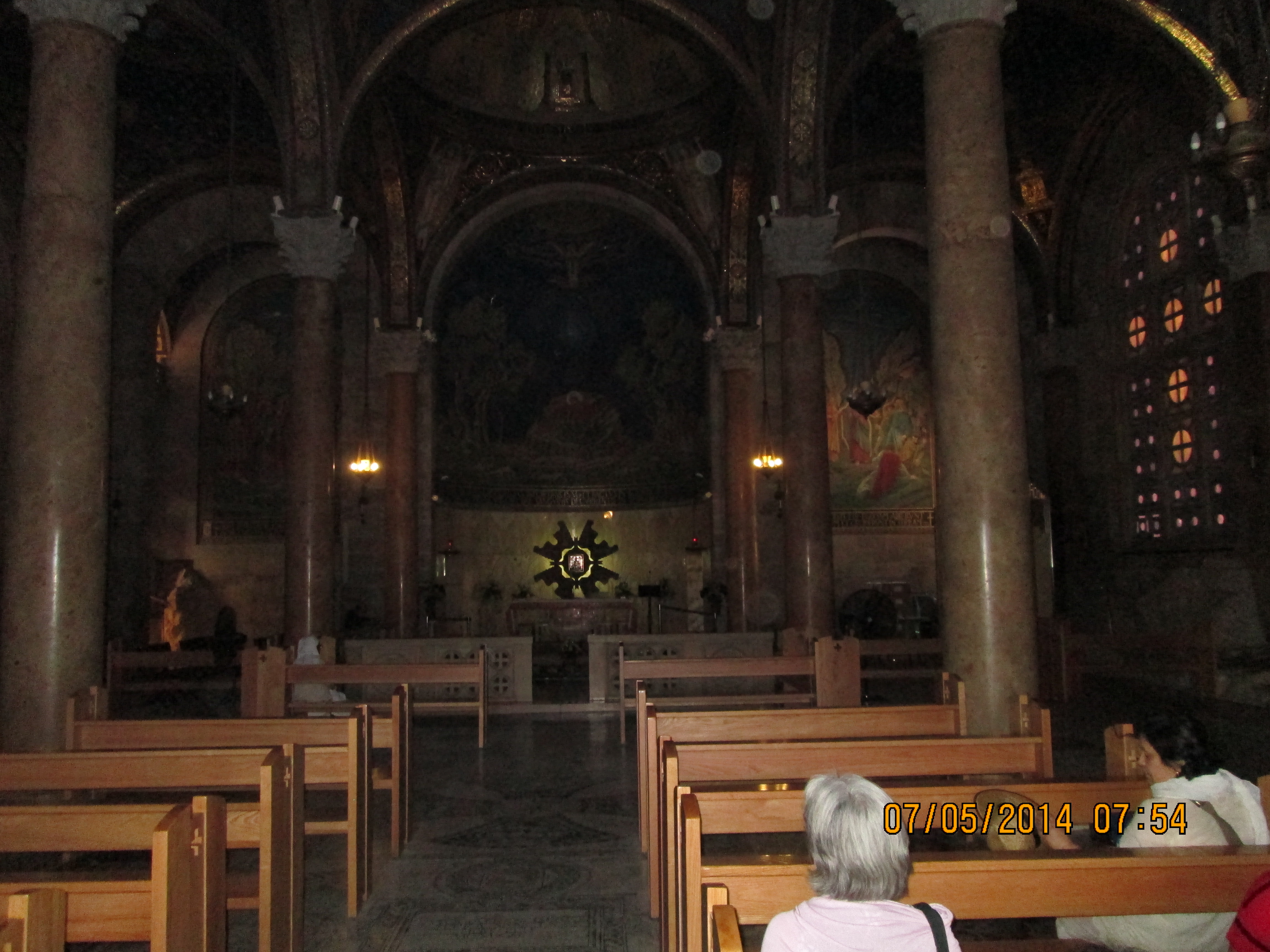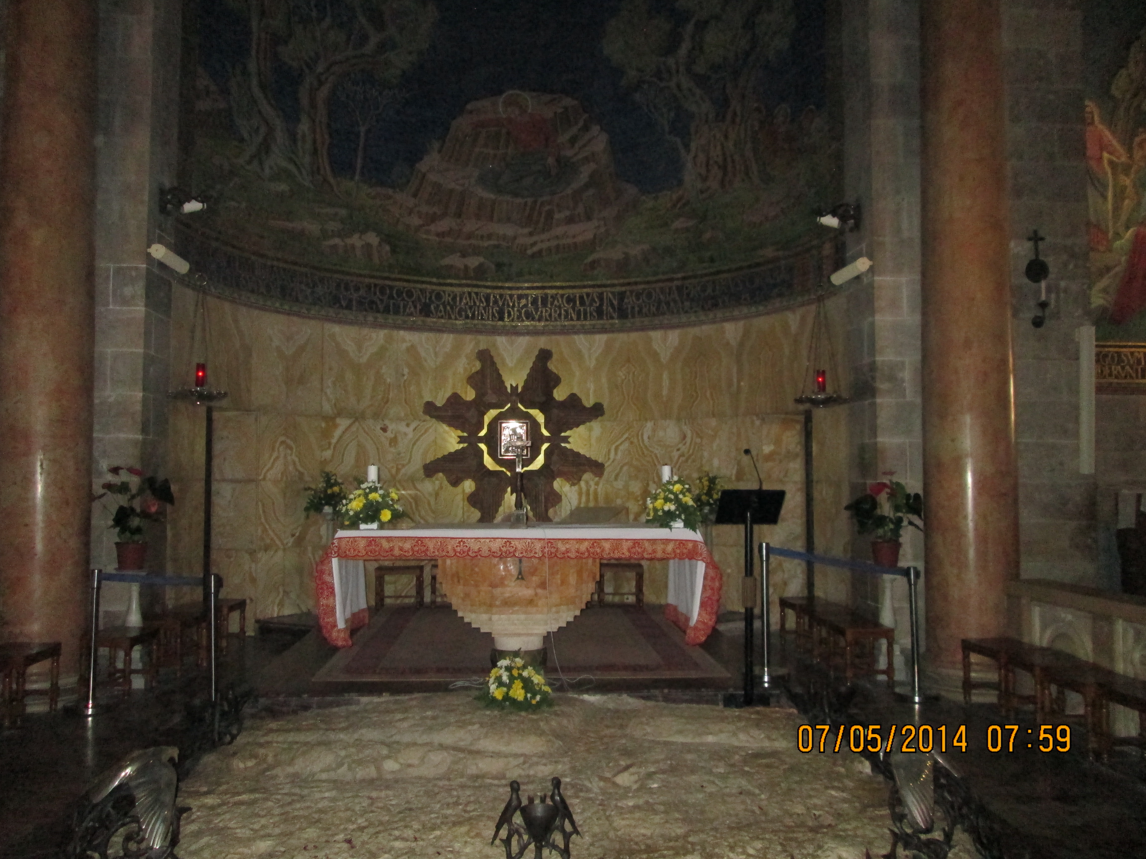 Just outside, and through the gardens–these gardens are said to be where Jesus went often to pray which is why he was so easy to find when Judas went to get him — is the Tomb of the Virgin Mary. and just off of that is the Grotto of Gethsemane which I think we spent more time in than Amos expected. Here is an internet description of it: