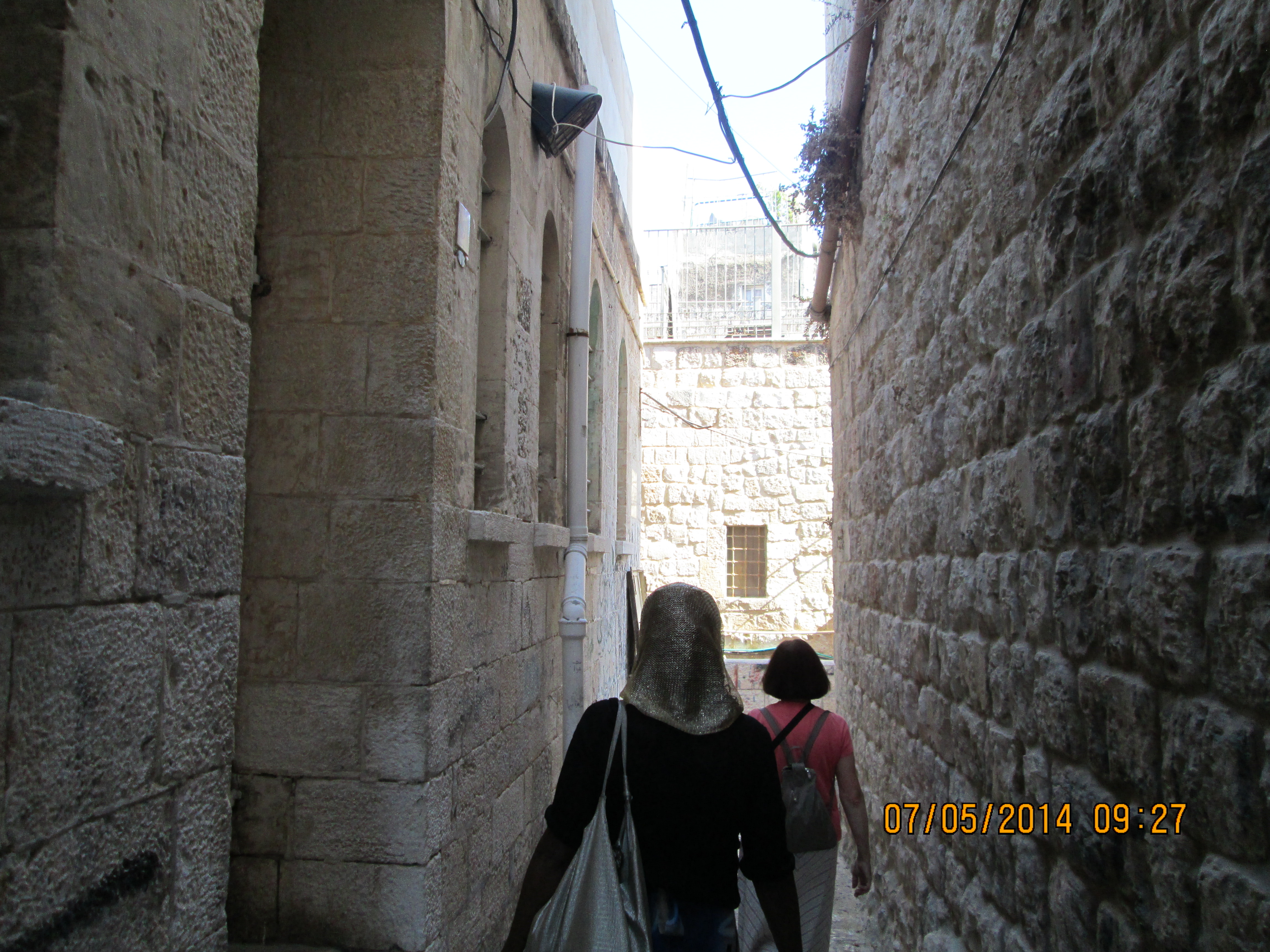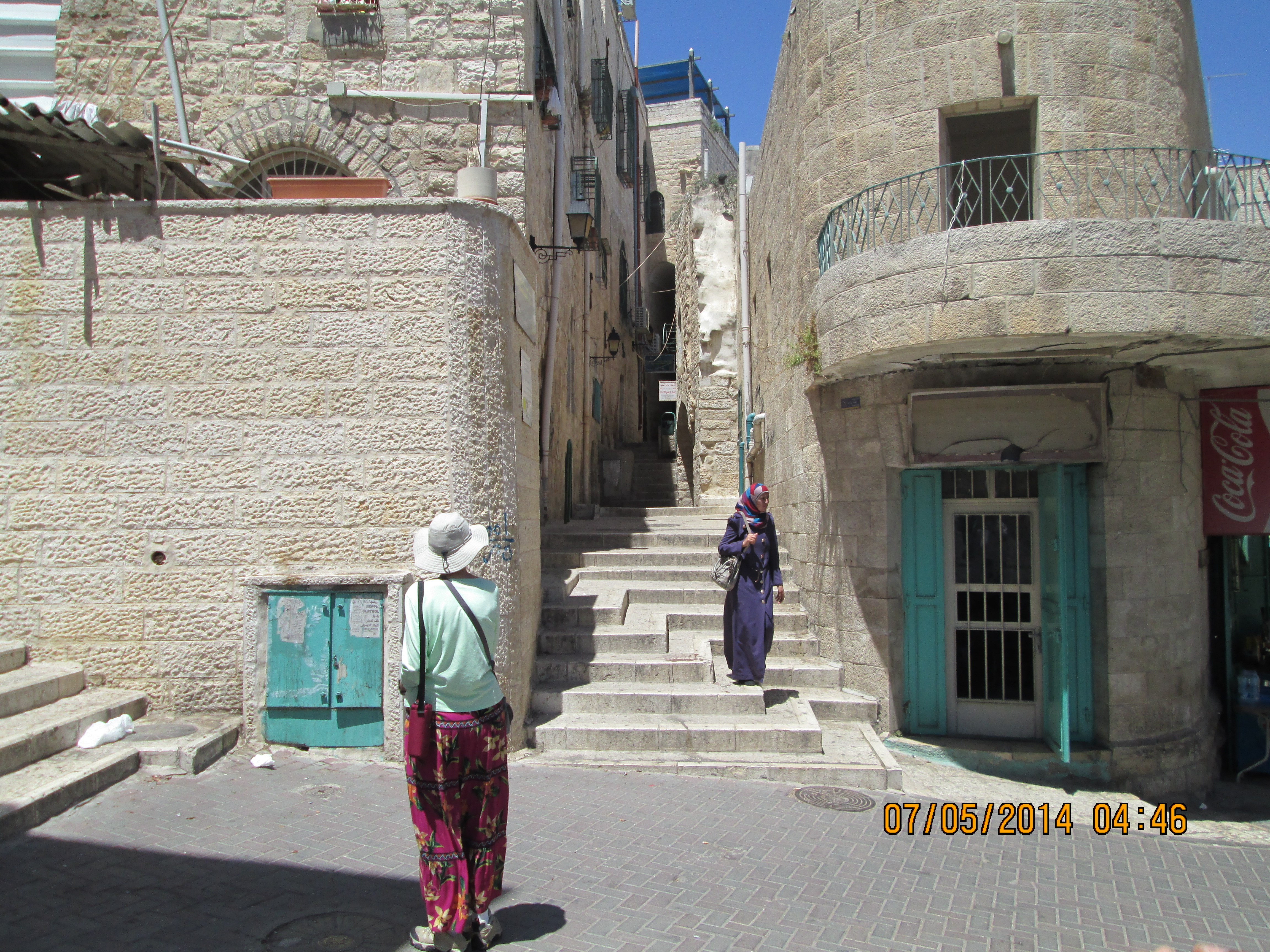 Walking in Muslim Quarter of East Jerusalem; each church sort has its own claim of where Jesus and Mary had experiences….