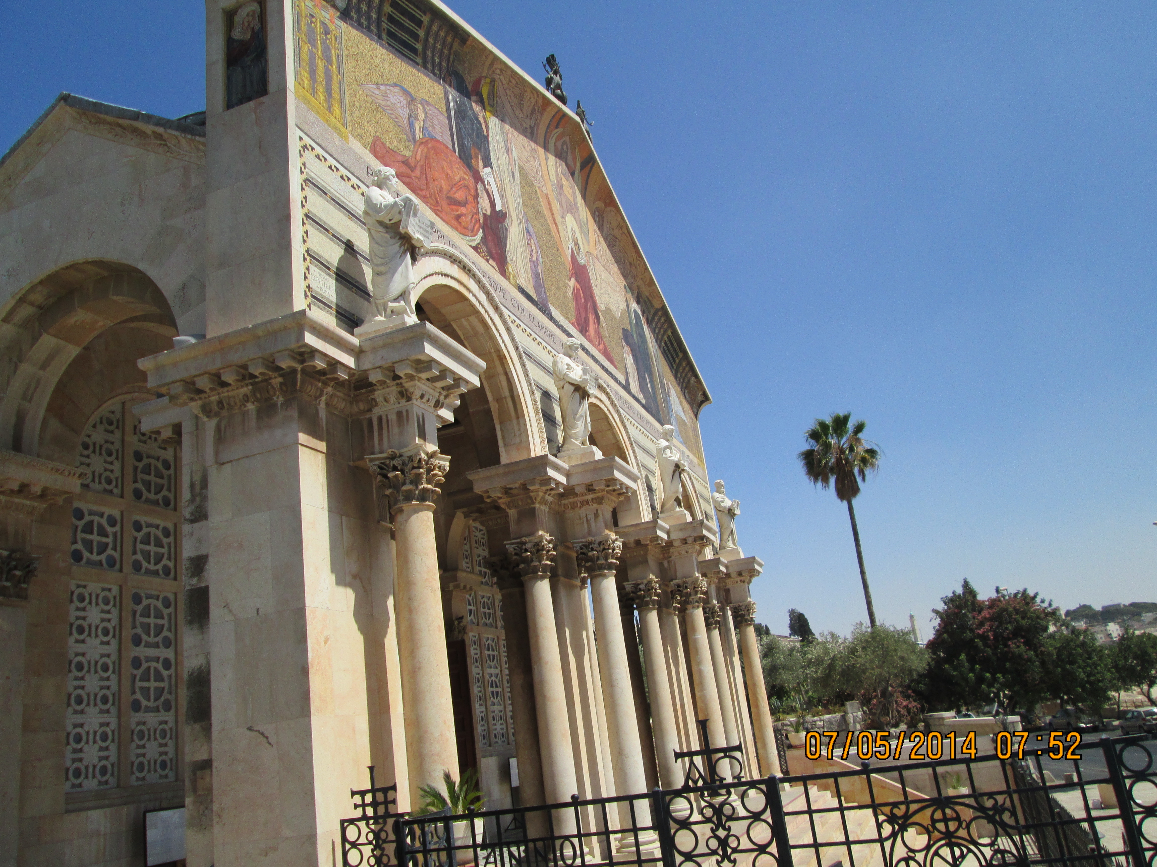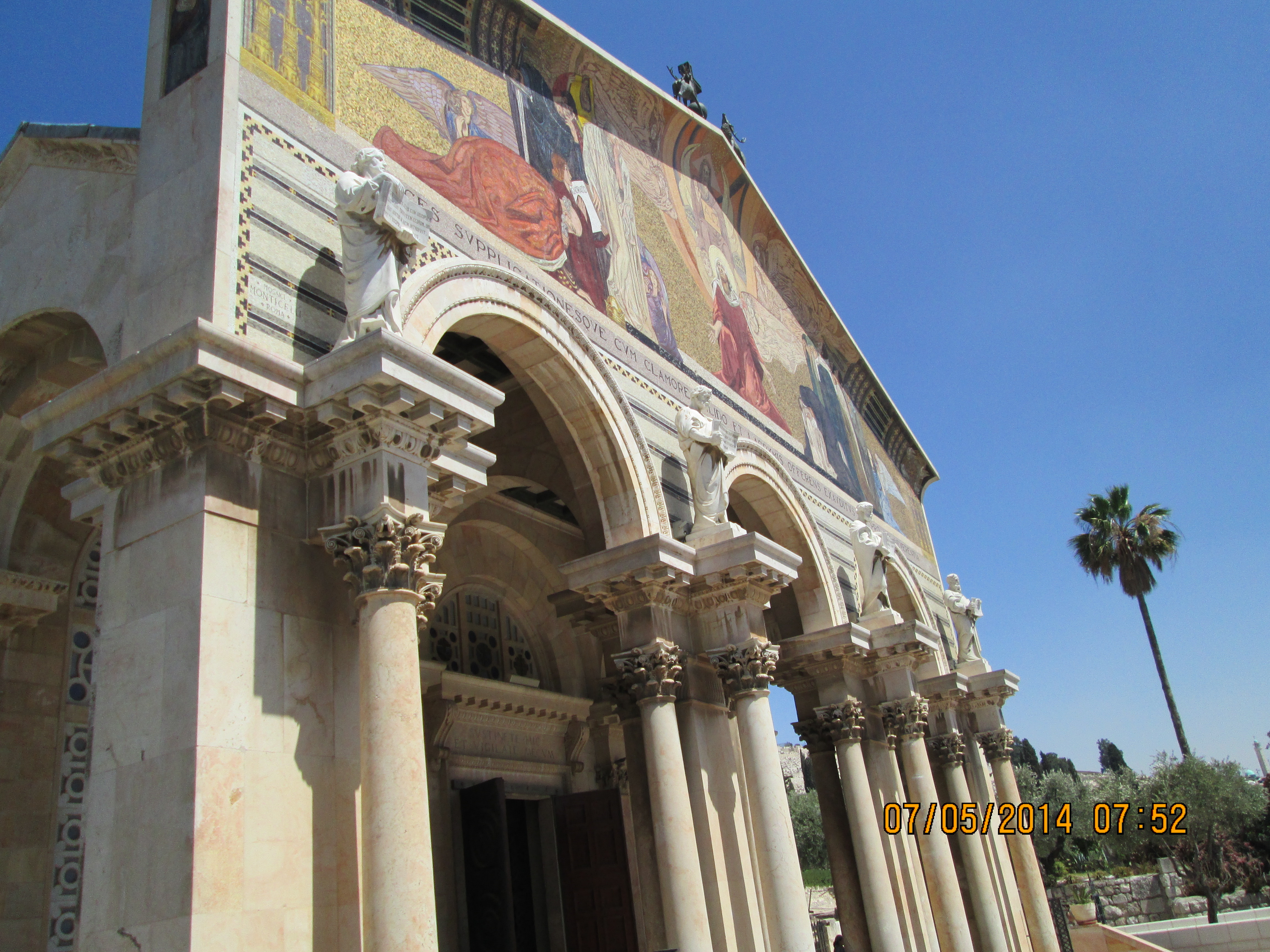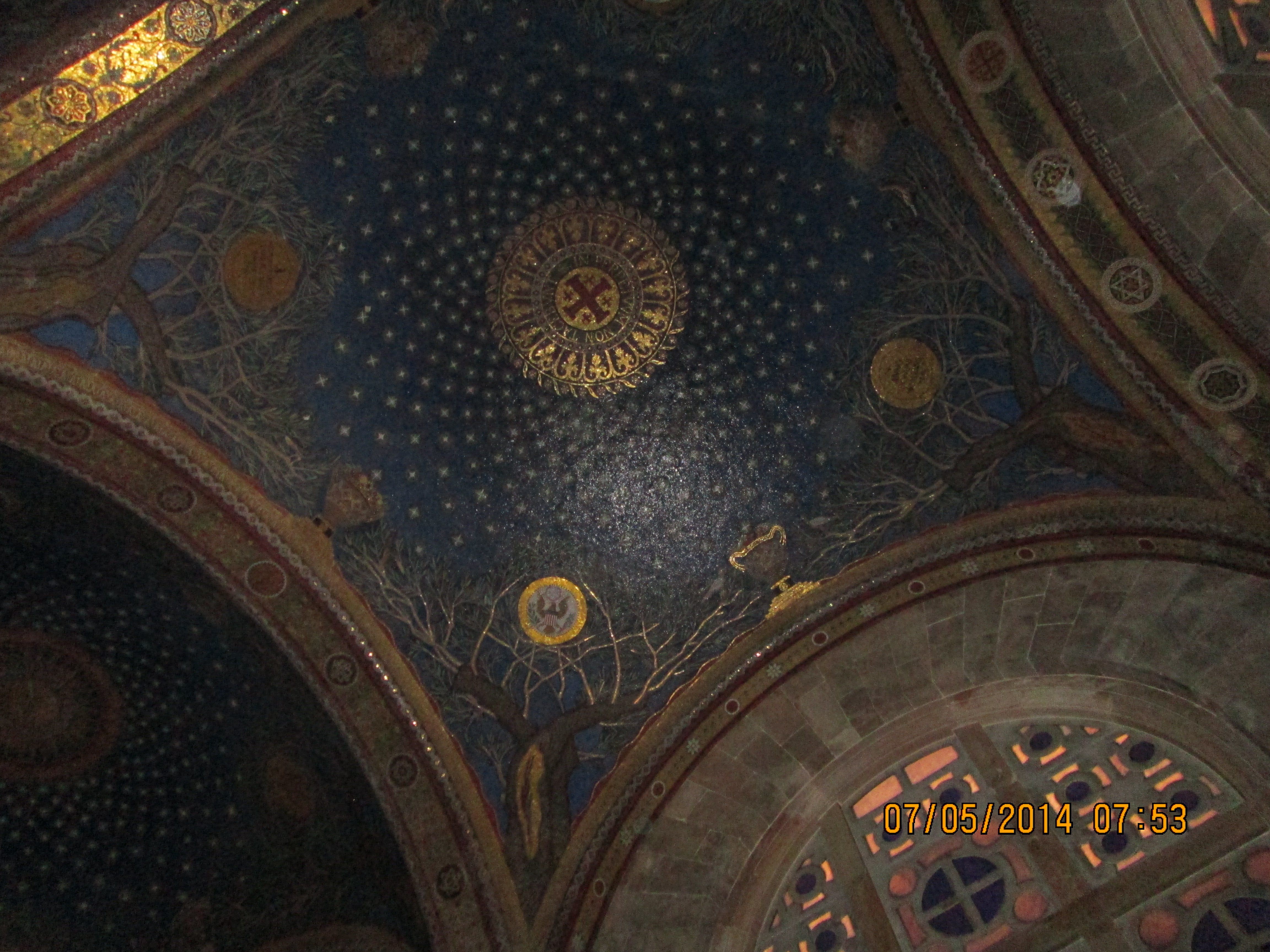 The views are incredible, but the unrest is also a bit more visible to me; I’m a bit more aware of exactly what seems to be going on. Many of our group wanted to go to the Mt. of Olives. That became “completely out of the question” I believe due to the unrest, but I preferred to think it was a time thing. In retrospect, I’m fairly certain it was due to safety. We weren’t very far away from ther when we went to Gethsemane. Some of the olive trees here are among the oldest known to all science and have been carbon-dated as being true to that claim. I am glad we went to Gethsemane (although I’m not sure I was all that glad as we hiked up there in the heat!). I wanted to see the Church of All Nations and, lo and behold, there it was. And it was beautiful. It is also called the Church of Jesus’ Agony. It is right off the garden of Gethsemane so we had to go almost no steps at all to be there. It is lovely inside with more mosaics that I tried to capture.