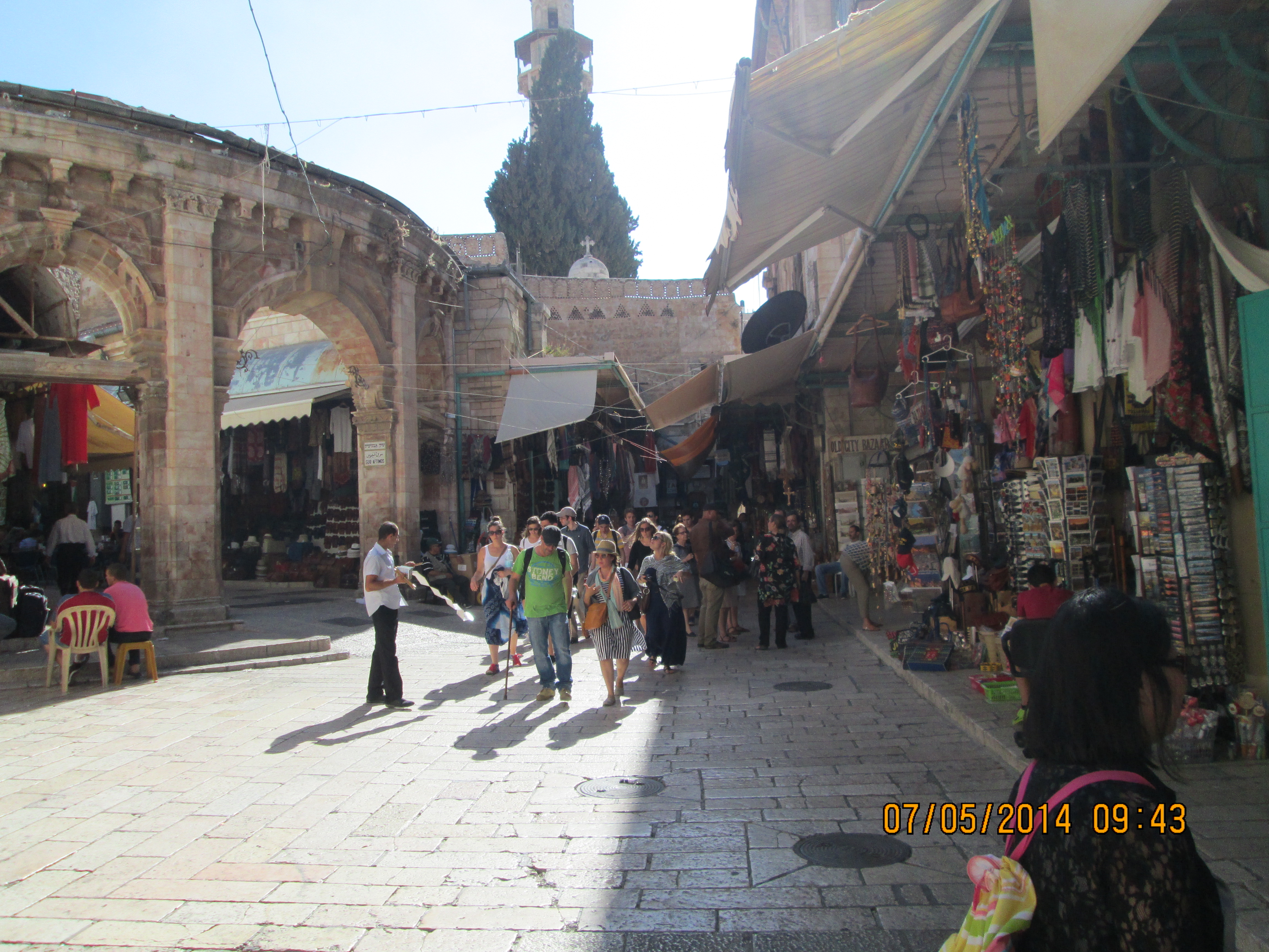 We walked as quickly as we could, which was not nearly quickly enough for Amos, through the Muslim Quarter. He is post-heart-attack and stil unfettered by the heat and steps we were enduring! My knees held out, I’m SHOCKED, and thrilled. There were a few times I was a bit overcome by heat, but for the most part, I did fine. Whenever I could I grabbed a stone or a rock or any sort of seat or shade. Not even because I needed it at that moment but because I never knew how long we were oging to be out in all this stuff! It was getting later in the day and it was also Ramedon…not that I know what that means to what people actually do during it. But I know Amos wanted us to move more quickly! We were trying to get to the Church of the Holy Sepulchre before what we hoped was a 5pm English mass so he could show us around! I wanted pictures of the 4 remaining Stations of the Cross!