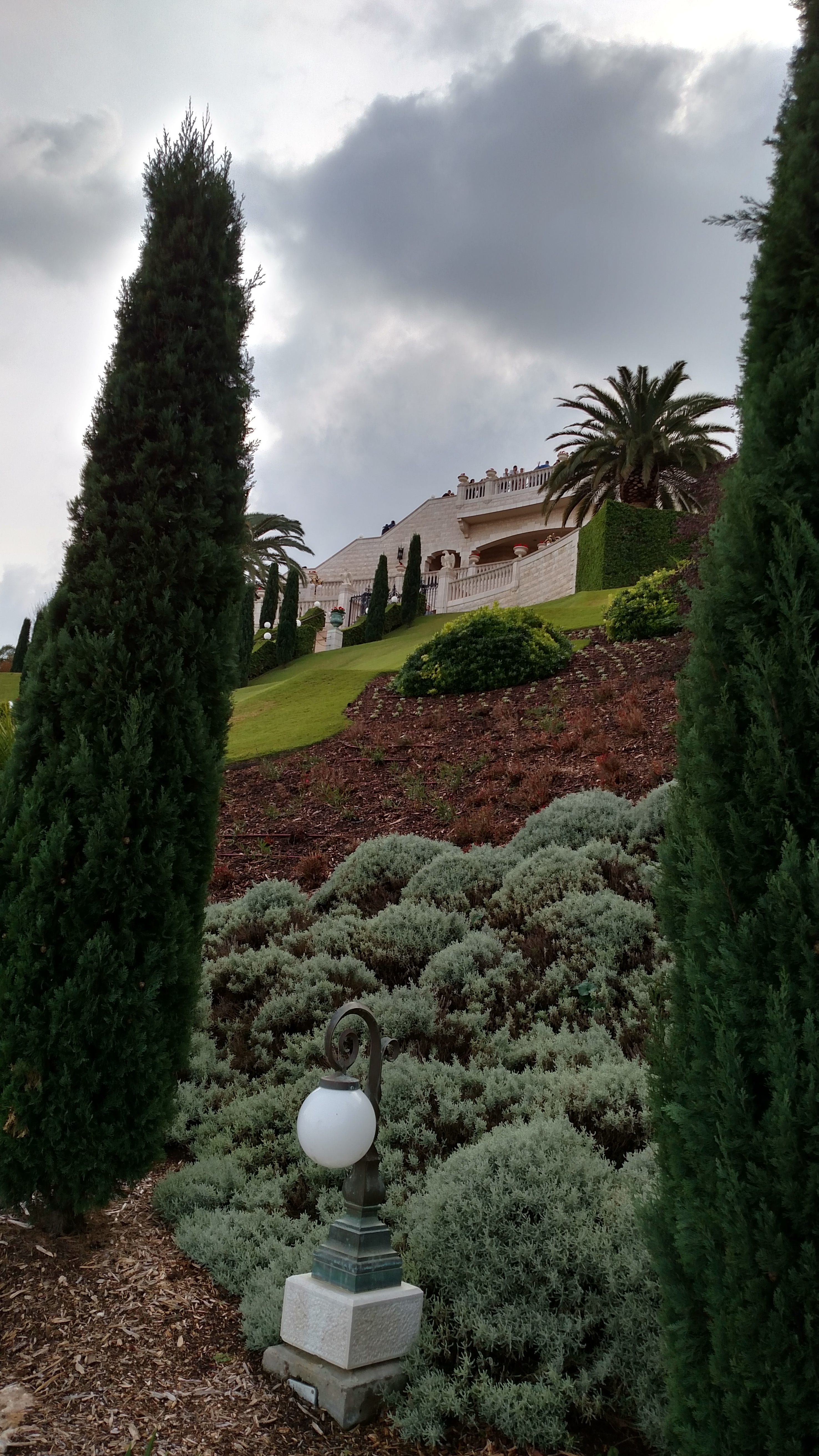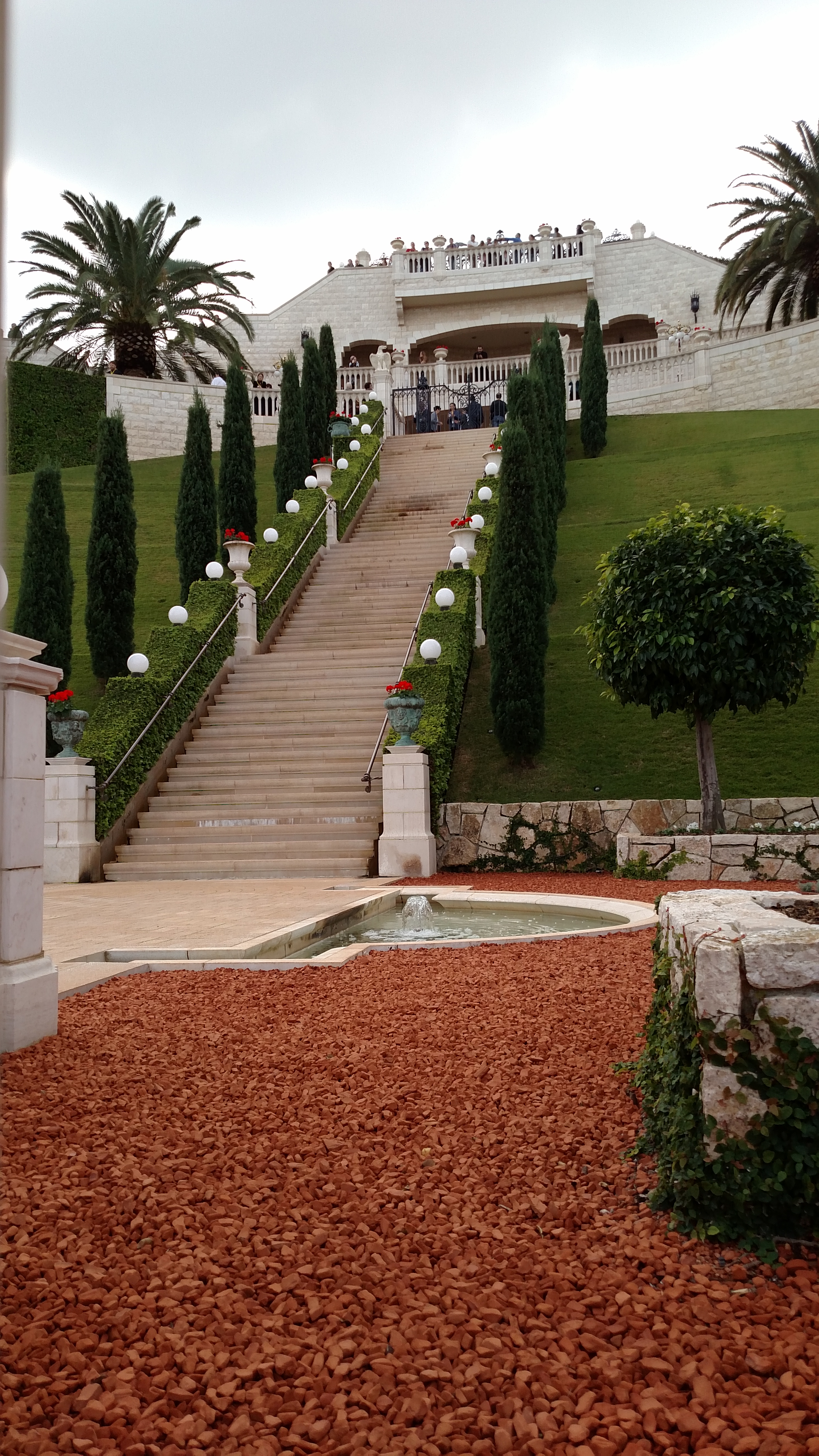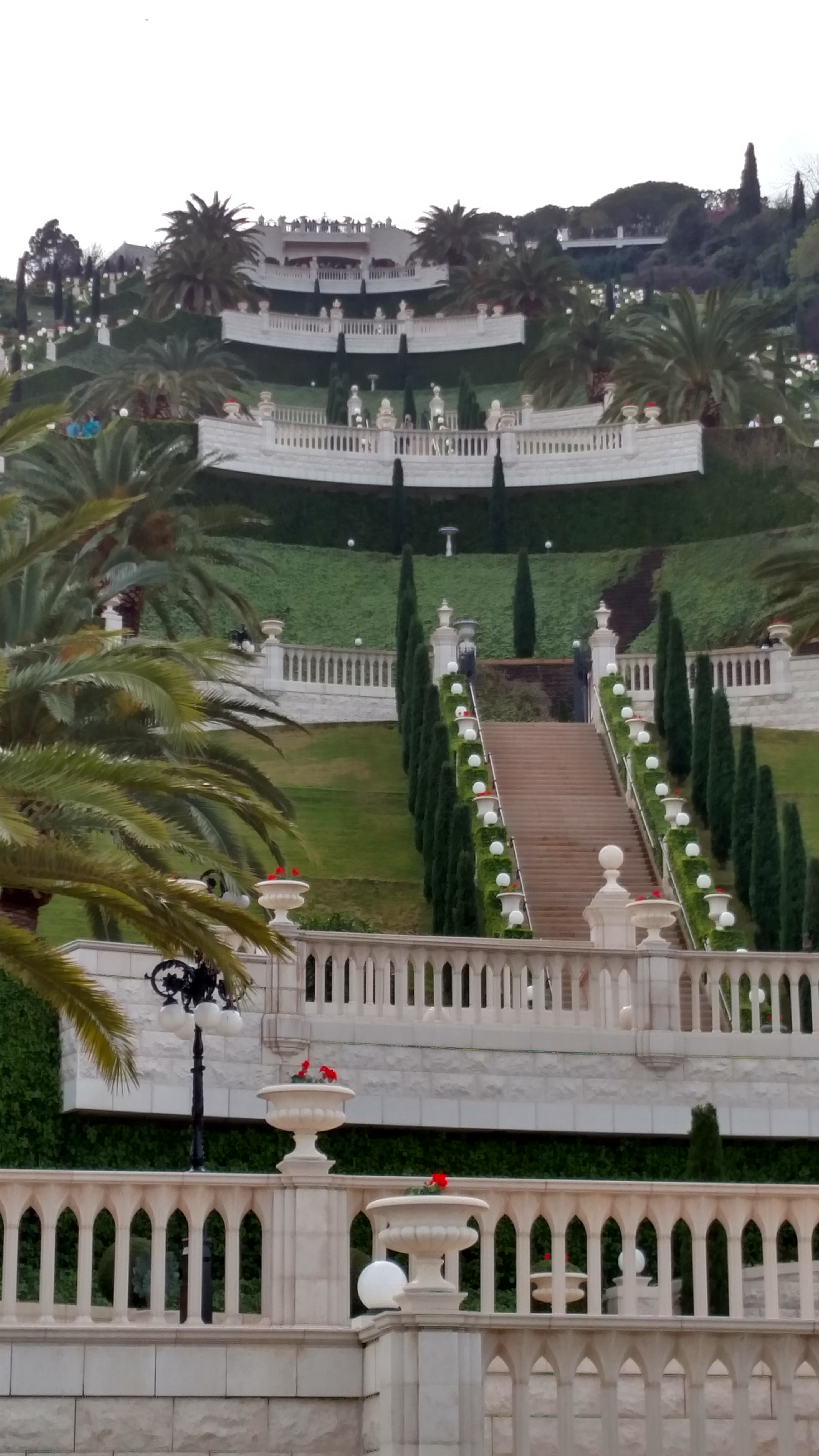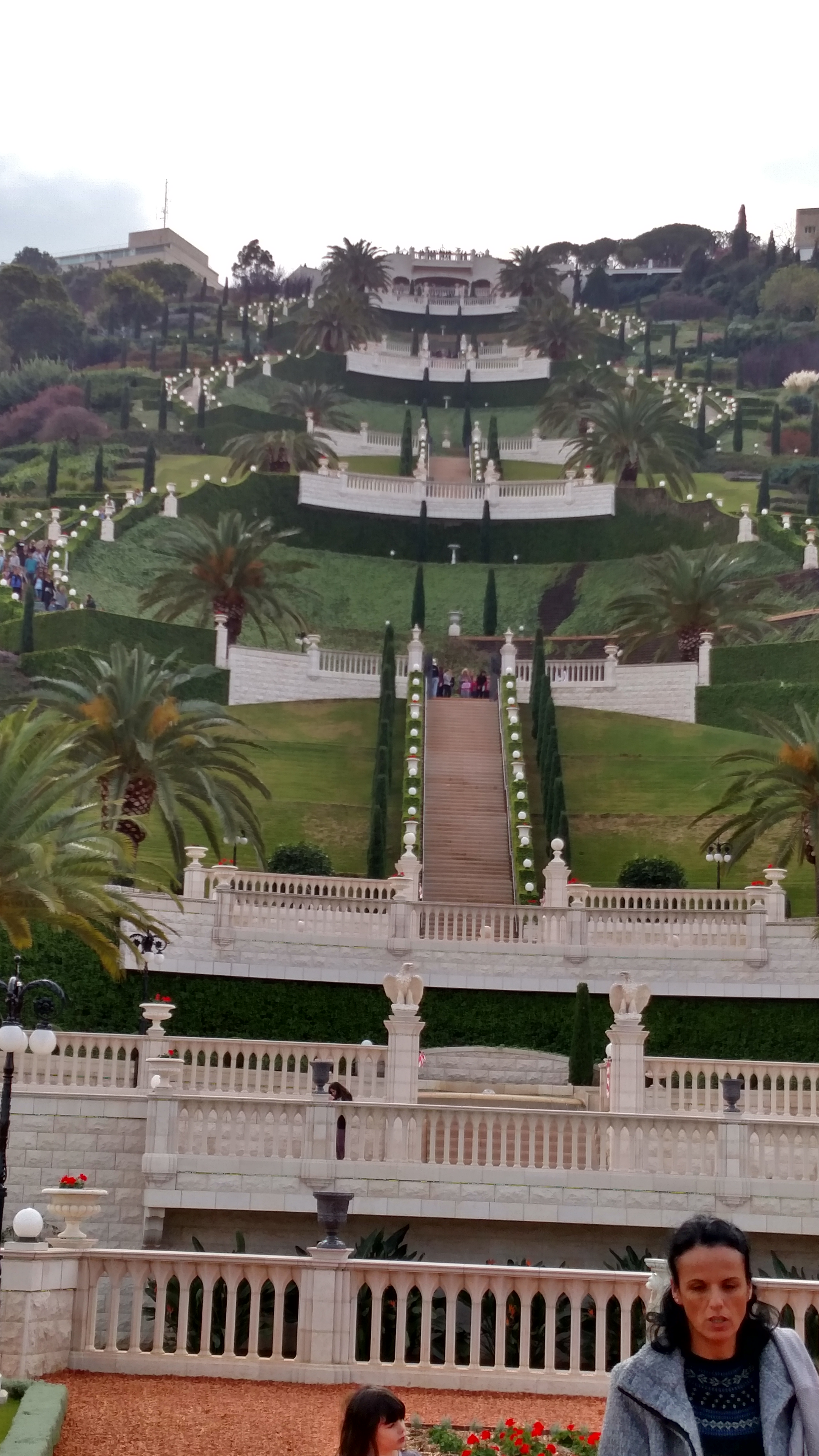 I was so excited to get to the Baha’i Gardens. Michaels “Kibbutz Mom” Mariana came and got us at 11am and drove us there. She was so wonderful. The English speaking tour began at Noon and we just made it in time. I wasn’t terribly nervous about it…I just KNEW I would be there in time. No way would I have missed this after making it all the way to Haifa! But Mariana got stuck parking the car and ended up on the Hebrew tour a groupo or two after us. It was good on one note; I wasn’t sure how I’d do with all these steps. You see the Baha’i Gardens and shrine in Haifa are nine enormous tiers that are kept in pristine condition by over 100 gardeners, some volunteer and some paid Israeli’s. There are over 700 stair steps from the top to the bottom; then another 700 plus steps (but not stairs) from there to the actual shrine. I had no clue how my legs would hold up to that, but I did fine; it was the NEXT day that I could barely walk!!!
