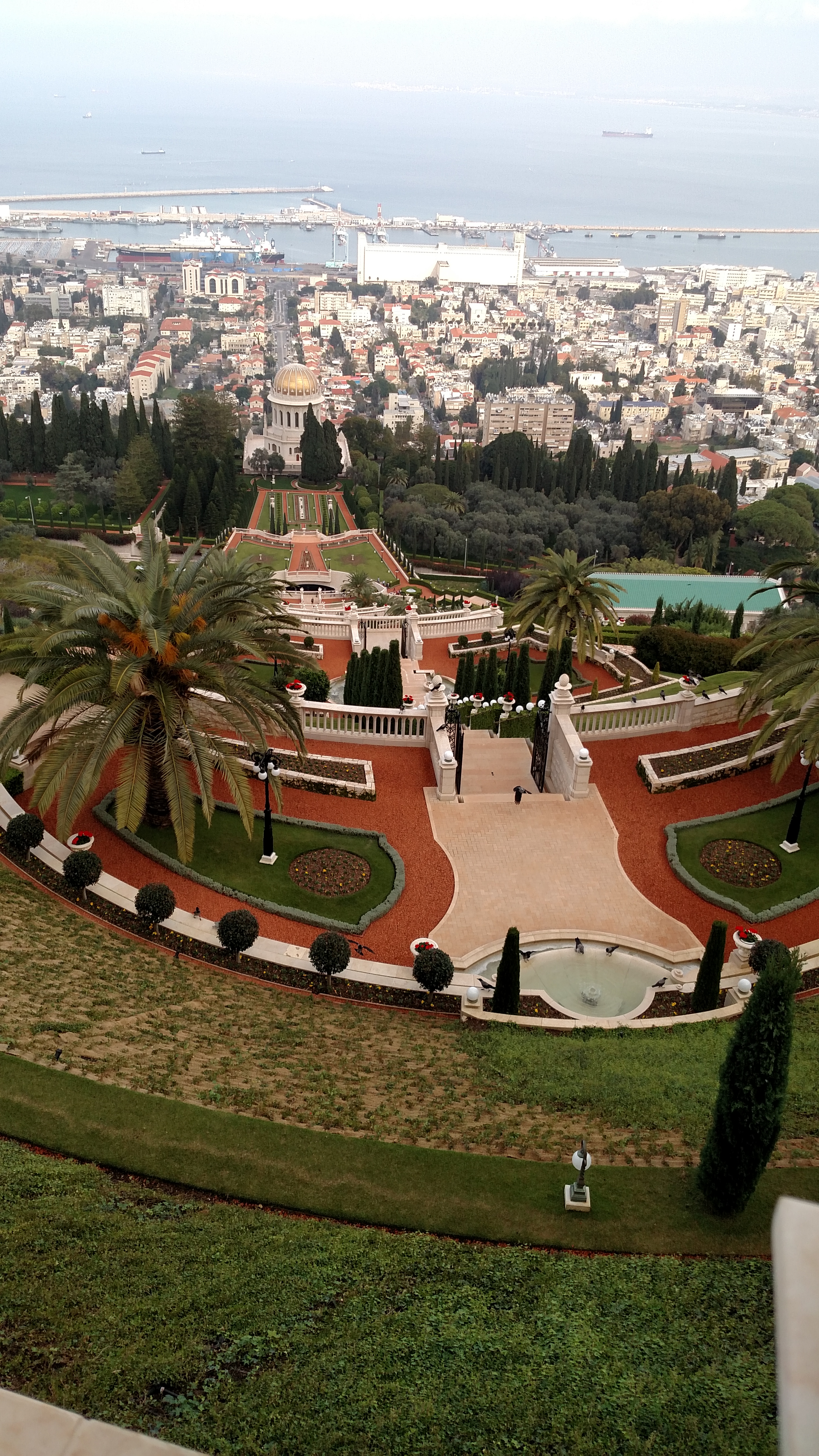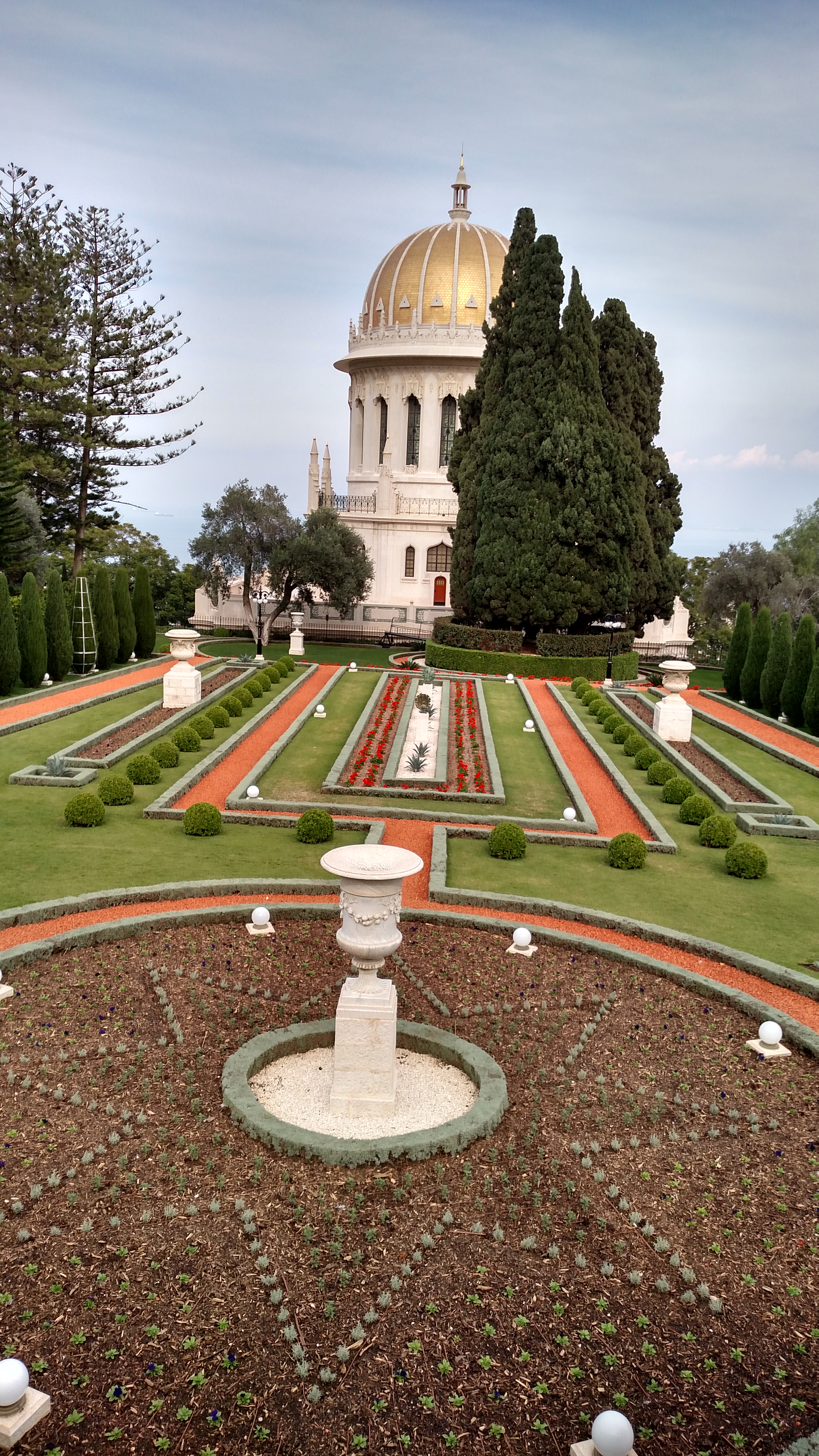 The Bahá’í Gardens in Haifa comprise a staircase of nineteen terraces extending all the way up the northern slope of Mount Carmel. The geometry of the complex is built around the axis connecting it with the City of ‘Akko, which also has great historical and sacred significance for Bahá’ís. At its heart stands the golden-domed Shrine of the Báb, which is the resting place of the Prophet-Herald of the Bahá’í Faith.