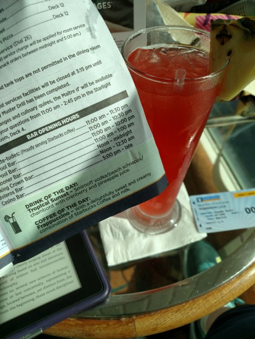 I’m spending most of the time with myself and with my textbook for my upcoming class that my professor asked me to read over the summer. I has only finished the Preface before boarding the ship! According to my kindle I’m nearing 1/4 done now