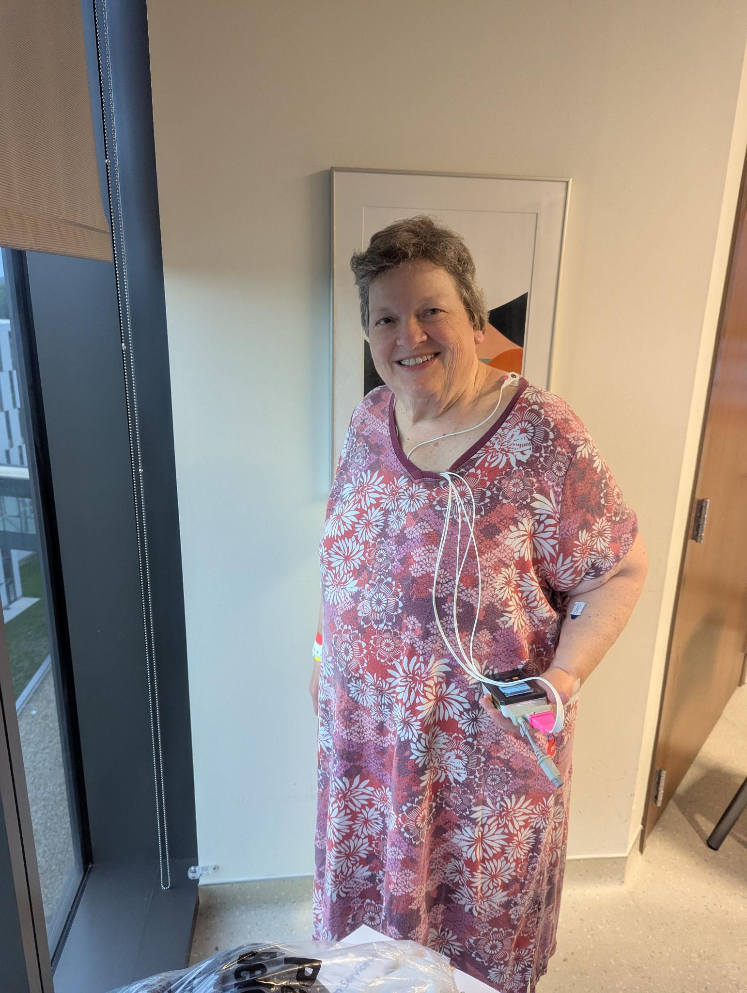 Below pic is from a couple weeks ago, hours after my cardiac ablation surgery. Thank goodness my kids made me take a nightgown… I needed to lay low and stay calm, etc. for 2 weeks, which ended day before yesterday! So that’s why I’m now allowed to develop a plan to build up my stamina and hopefully get on my bike again. Although my ortho surgeon is not as excited for me to get on my bike. Everything else I want to do is fine, but he has warned me of the risks of falling and what it could mean for my knee. So I’m hesitant but hopeful!
